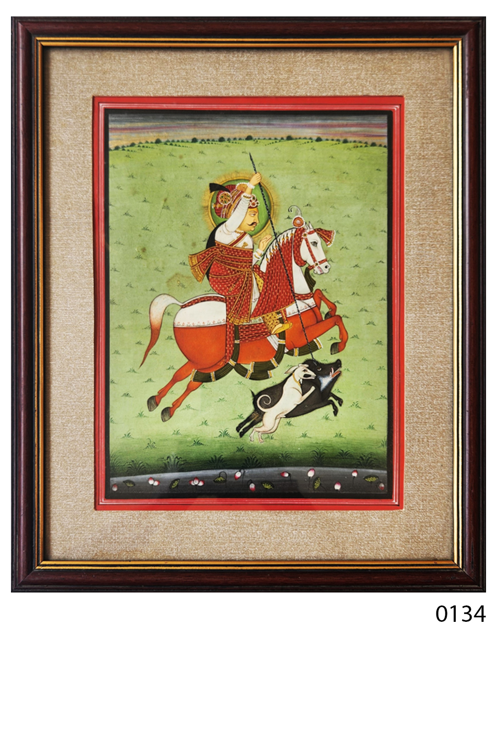 The image shows a beautifully framed miniature painting of a royal figure on horseback, engaged in a hunting scene. The hunter, dressed in traditional regal attire, is about to strike a wild boar with a spear. The painting is detailed and vibrant, capturing the essence of a royal hunt with elegance and precision. This artwork is interesting for its historical and cultural significance, as well as its intricate craftsmanship. This exquisite miniature painting depicts a royal hunter on a majestic horse, poised to strike a wild boar with a spear. The painting is rich in detail and vibrant colors, showcasing the following features: