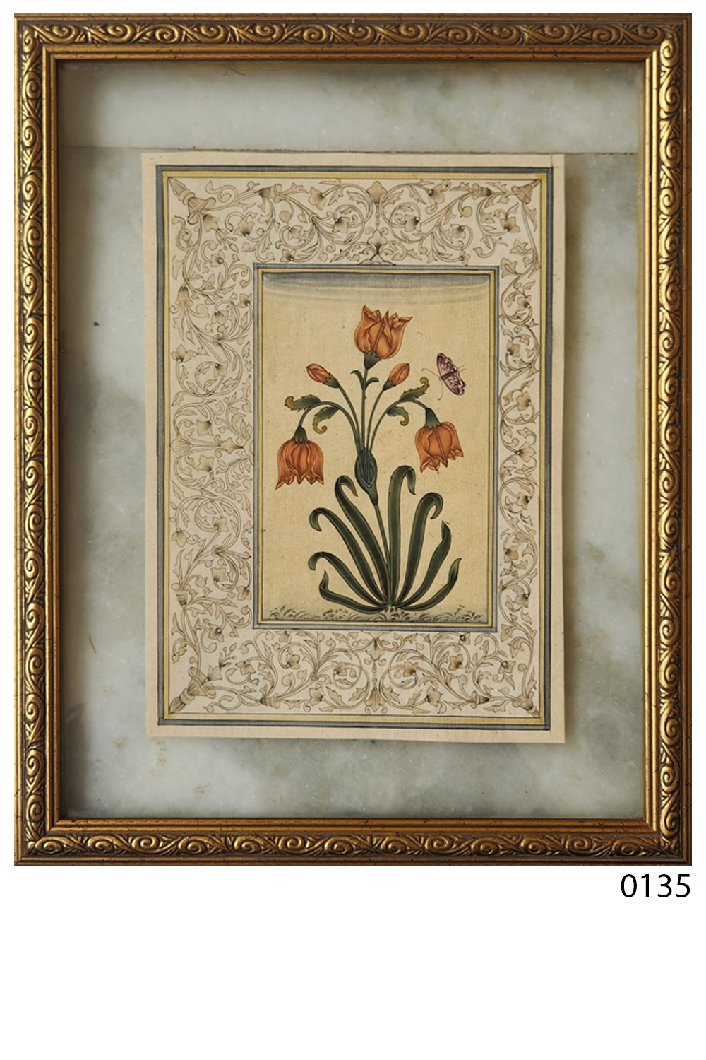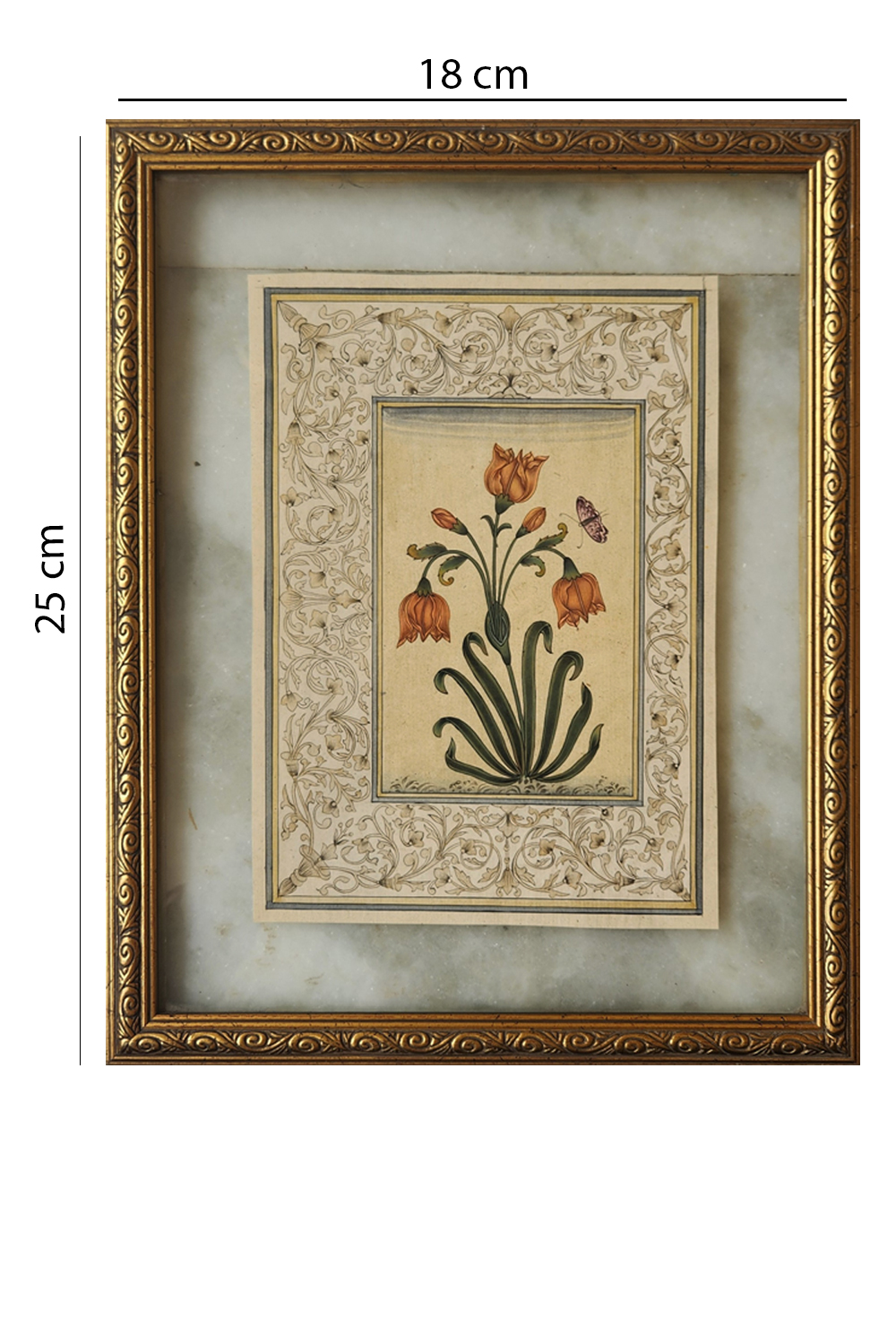 This exquisite miniature painting showcases a central floral motif with vibrant orange flowers and a butterfly, set against a beige background. The painting is framed by an ornate border featuring intricate floral and vine patterns. The artwork is characterized by:
