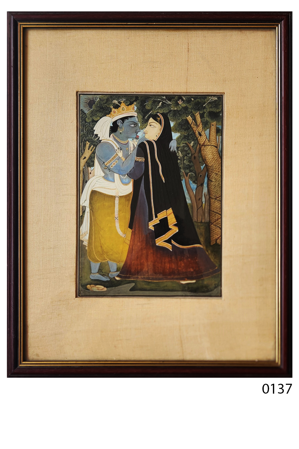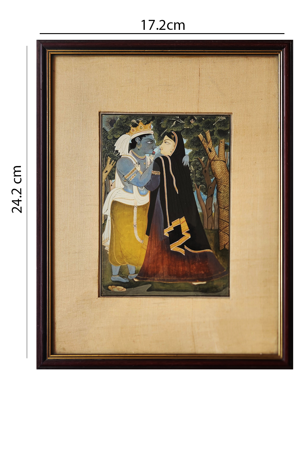 This exquisite miniature painting captures a serene and intimate moment between a divine couple, likely inspired by Hindu mythology. The male figure, adorned with a crown and royal attire, is depicted with blue skin, symbolizing divinity. The female figure, dressed in a dark, flowing garment with golden accents, stands close to the male figure, suggesting a deep connection. The background features a lush forest with detailed trees and foliage, adding to the mystical ambiance. The painting is framed in a simple yet elegant wooden frame, enhancing its traditional appeal.