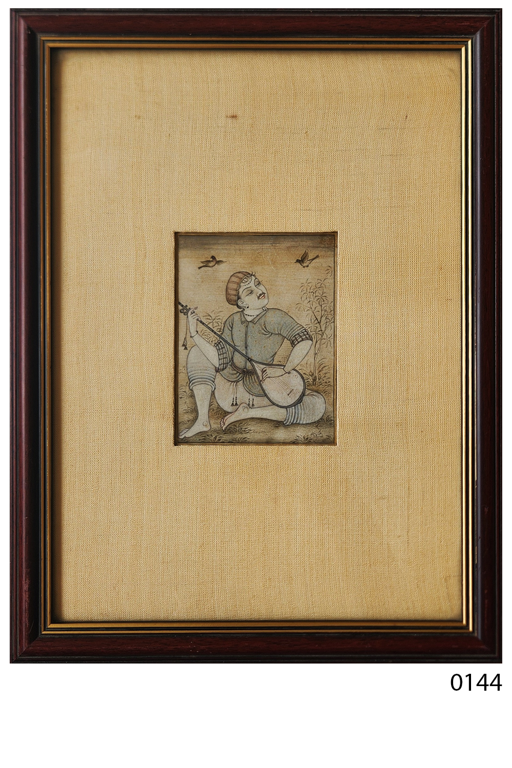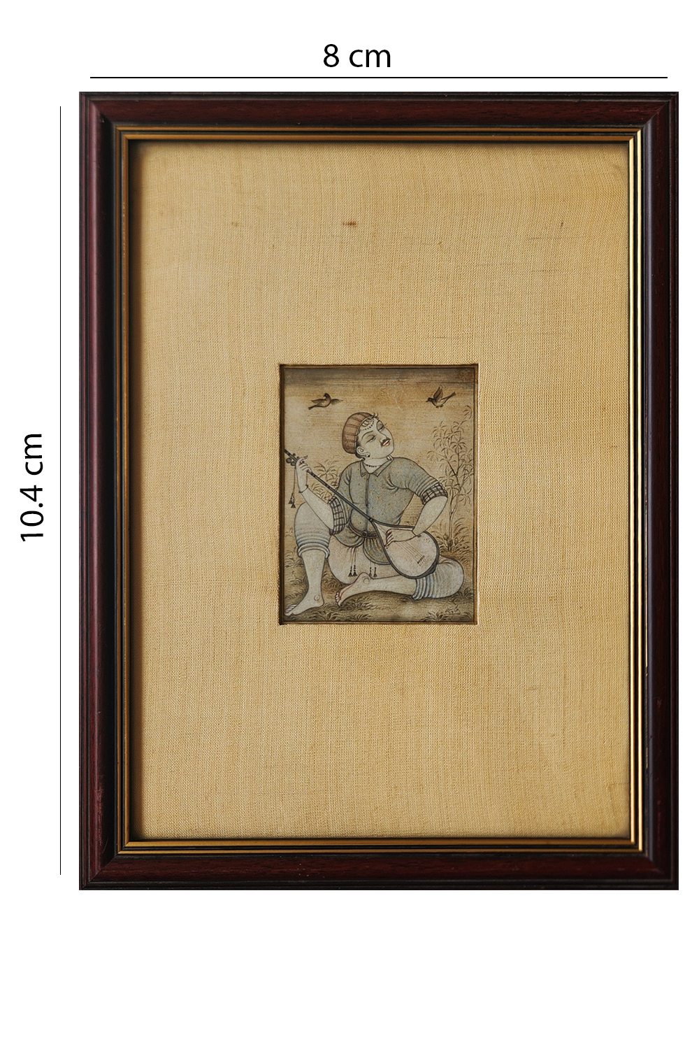 The image shows a framed miniature painting of a musician playing a stringed instrument. The musician is depicted in traditional attire, seated on the ground with a serene expression. The background features foliage and birds, adding to the peaceful setting. The painting is framed in a simple, elegant frame, making it a beautiful piece of art that captures a moment of musical tranquility. This exquisite miniature painting captures a serene moment of a musician engrossed in playing a stringed instrument. The artwork is characterized by: