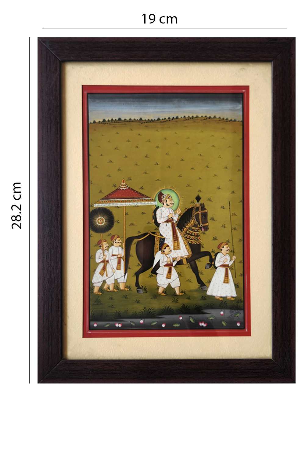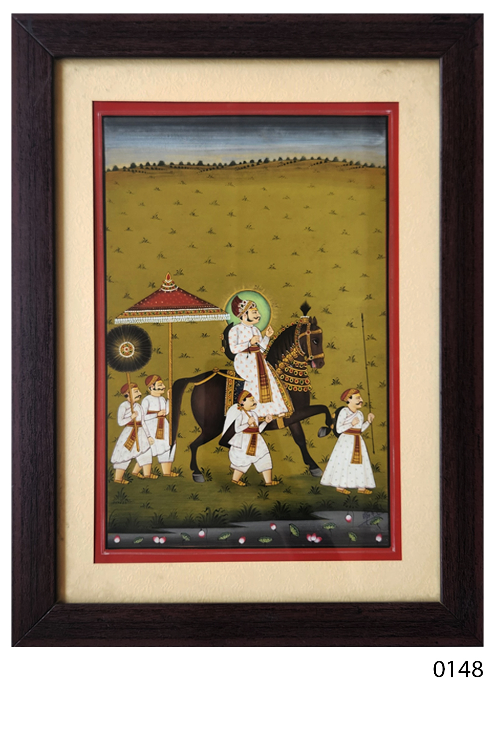 This exquisite miniature painting depicts a royal figure, possibly a king or noble, riding a richly adorned horse. The scene is set against a serene, open landscape with a distant horizon. The royal figure is surrounded by attendants, each dressed in traditional attire. One attendant holds a ceremonial parasol, another carries a fan, and two others walk alongside, adding to the grandeur of the procession. The painting is characterized by its intricate detailing, vibrant colors, and the use of gold accents, which highlight the opulence of the scene. The figures are depicted with delicate brushwork, showcasing the artist's skill in capturing the elegance and majesty of the royal entourage.