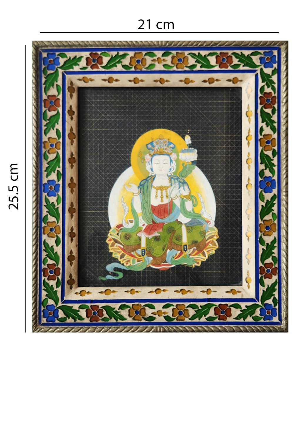 This exquisite miniature painting, titled "Divine Serenity," showcases a deity seated in a meditative pose, surrounded by a radiant halo. The deity is adorned with elaborate jewelry and holds symbolic objects in multiple hands. The painting is framed with a beautifully detailed border featuring colorful floral motifs. The frame itself is a work of art, enhancing the overall aesthetic appeal of the piece. The intricate details and vibrant colors make this painting a captivating representation of divine tranquility.