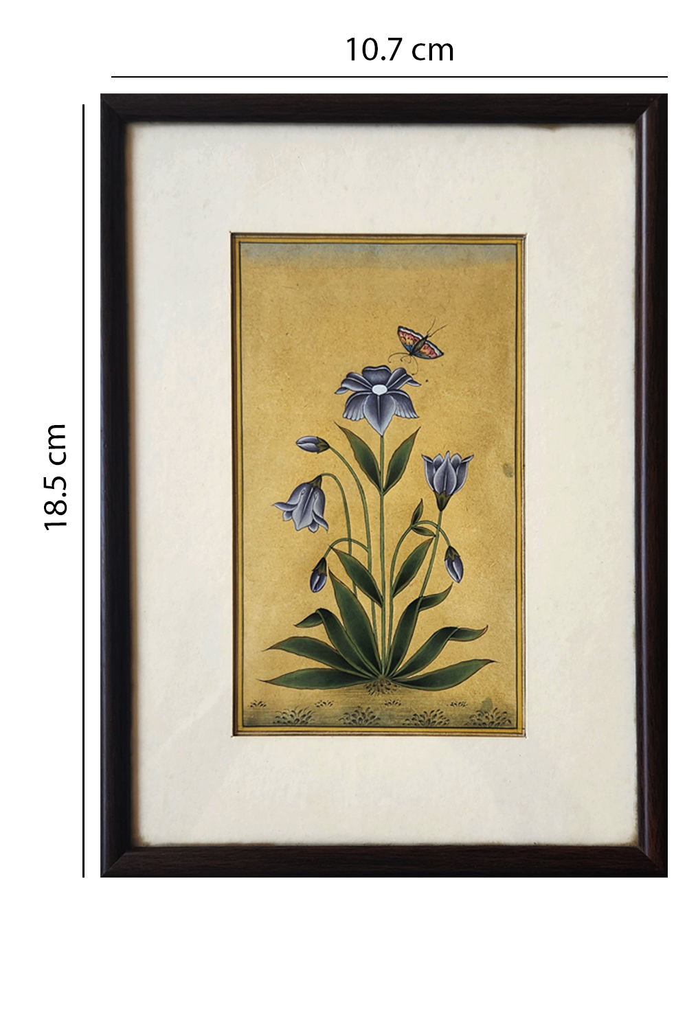 This exquisite miniature painting captures the serene beauty of nature with a butterfly gracefully hovering above a cluster of blue flowers. The artwork is characterized by its intricate detailing and vibrant colors, set against a muted background that enhances the central elements. The painting features: