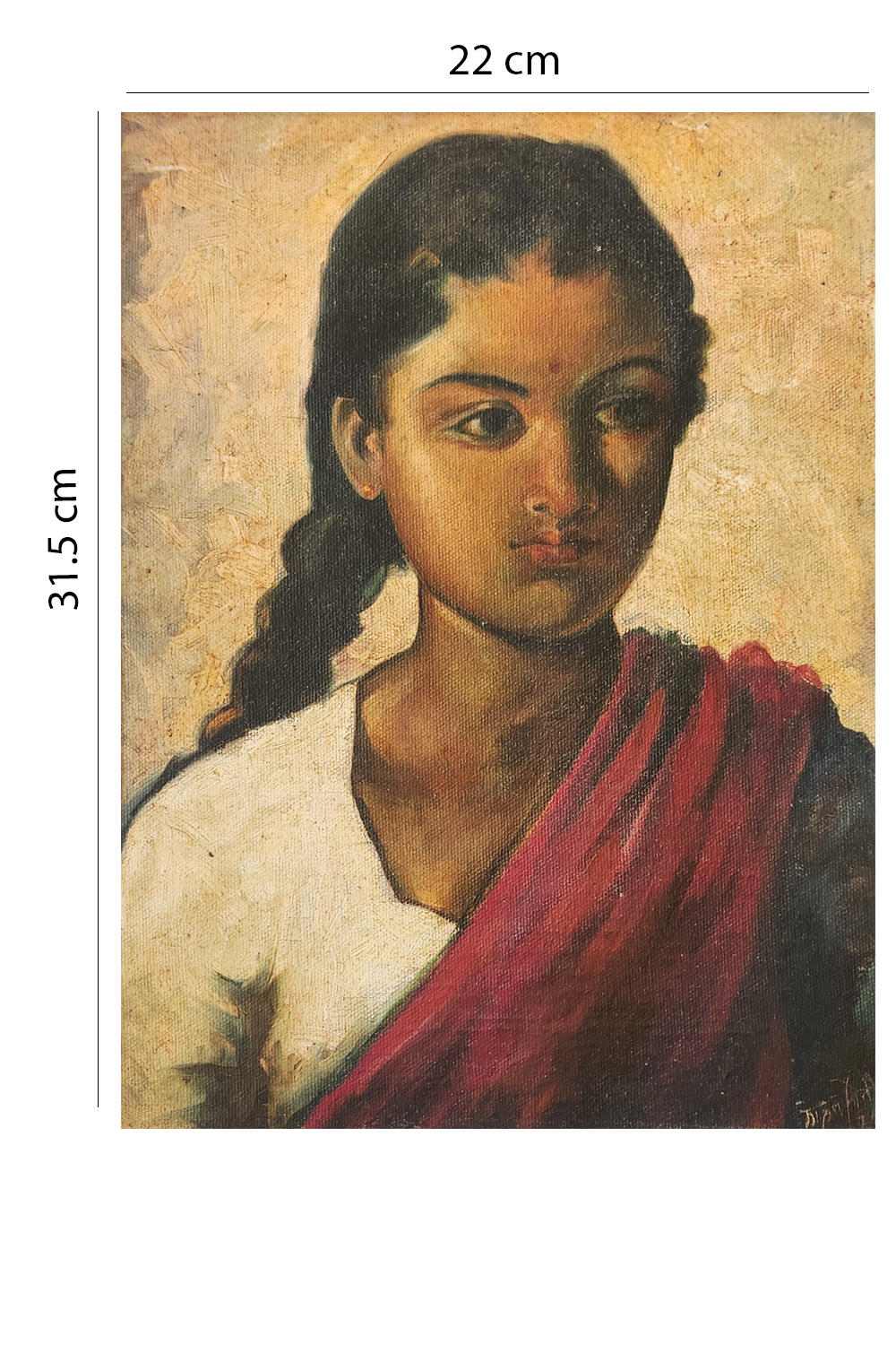This oil painting captures the essence of traditional attire through its detailed depiction of a woman. The painting features: