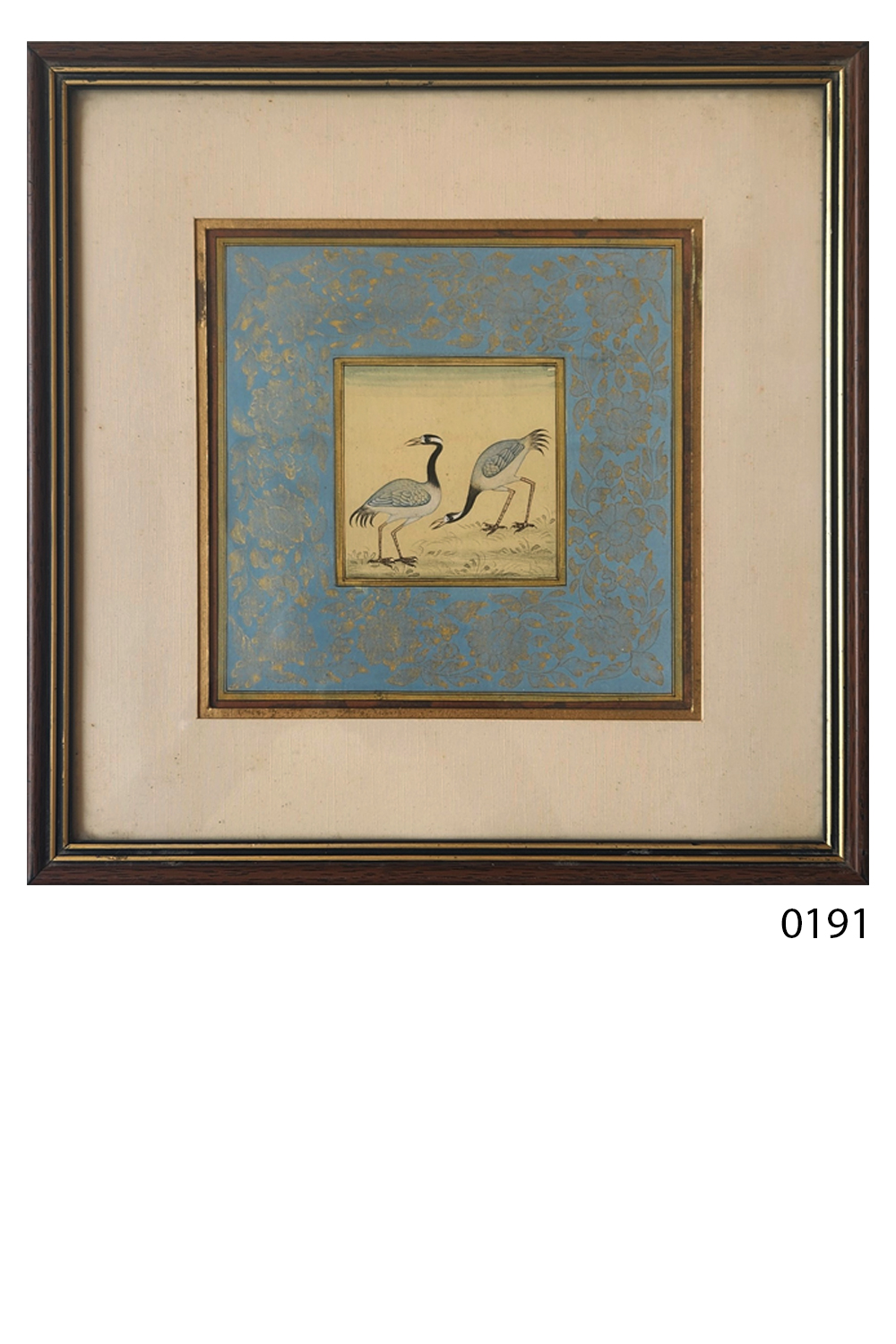 This exquisite miniature painting captures the elegance of two cranes, rendered with fine detail and precision. The artwork is set against a soft, neutral background, allowing the birds to stand out prominently. The painting is framed with a beautiful blue border adorned with gold floral motifs, adding a touch of opulence. The cranes are depicted in a dynamic pose, suggesting movement and grace. The use of subtle colors and intricate brushwork highlights the artist's skill and attention to detail.