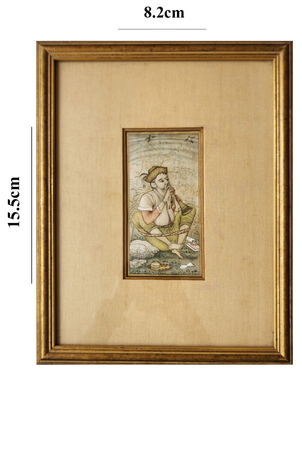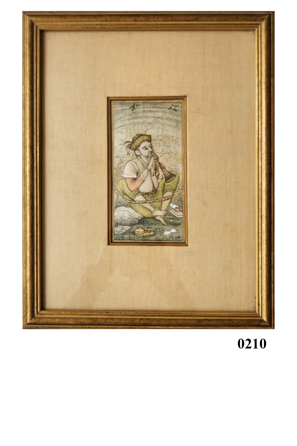 This exquisite miniature painting captures a musician deeply engrossed in playing a traditional wind instrument. The musician is seated cross-legged on the ground, surrounded by nature. The background features delicate foliage and birds in flight, adding to the serene ambiance. The musician's attire is traditional, with a white upper garment and green lower garment. The painting also includes small objects like a teapot and papers, suggesting a moment of leisure and contemplation. The intricate details and muted color palette highlight the artist's skill and the cultural significance of the scene.