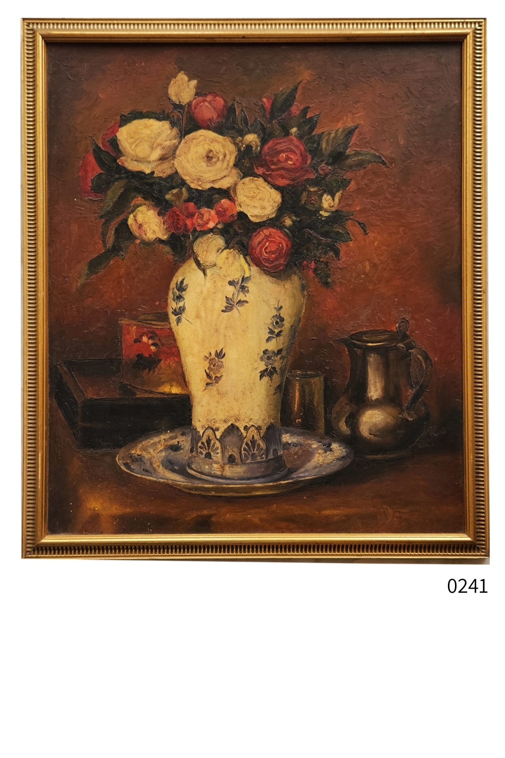 This oil painting captures the timeless beauty of a still life arrangement with meticulous detail and rich colors.