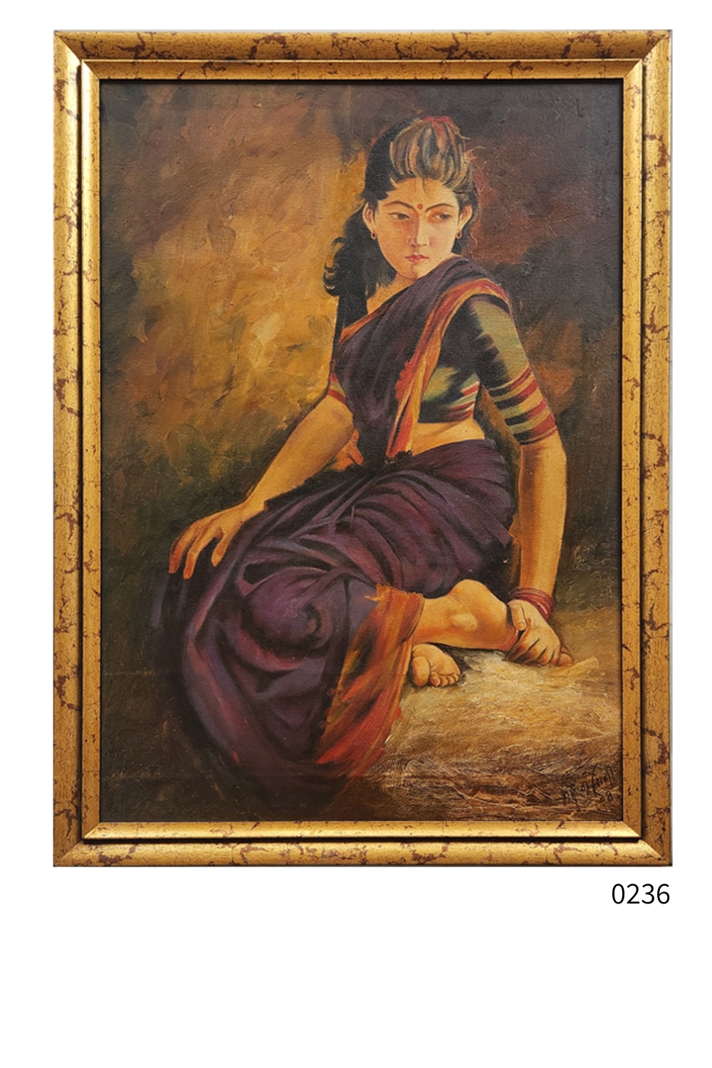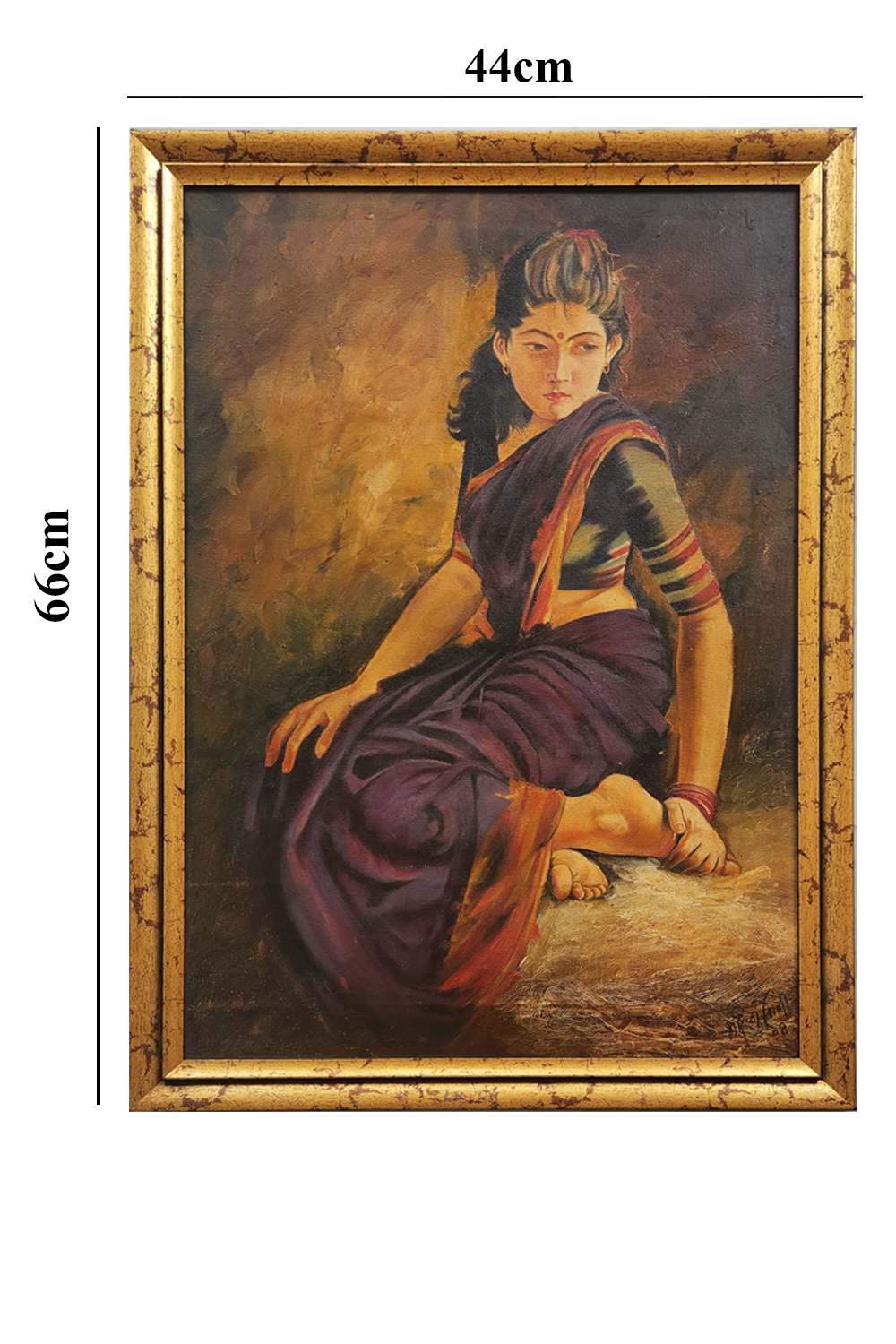 This oil painting captures the essence of traditional elegance and quiet introspection. The woman is adorned in a deep purple sari with red and gold accents, seated on the ground with one leg folded beneath her. Her posture exudes grace and calmness, with her right hand resting gently on the ground and her left hand on her knee. The background is a blend of warm, earthy tones, enhancing the overall mood of tranquility. The intricate details of her attire, including the multiple bangles on her arm and the subtle folds of her sari, showcase the artist's meticulous attention to detail.