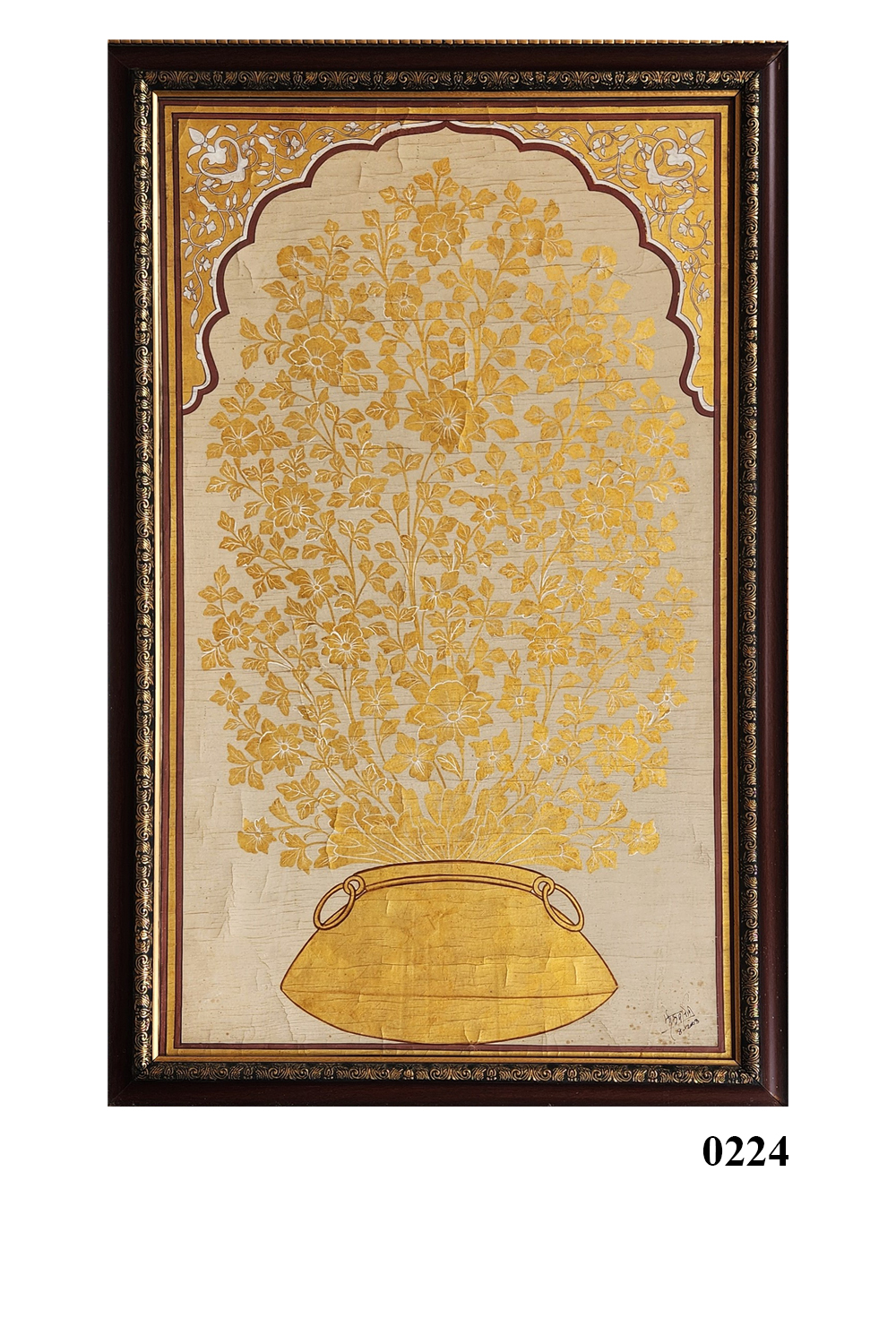 This exquisite panel painting showcases a detailed and intricate golden floral design, emanating from a traditional vase. The artwork is framed with an ornate border that enhances its elegance. The painting features: