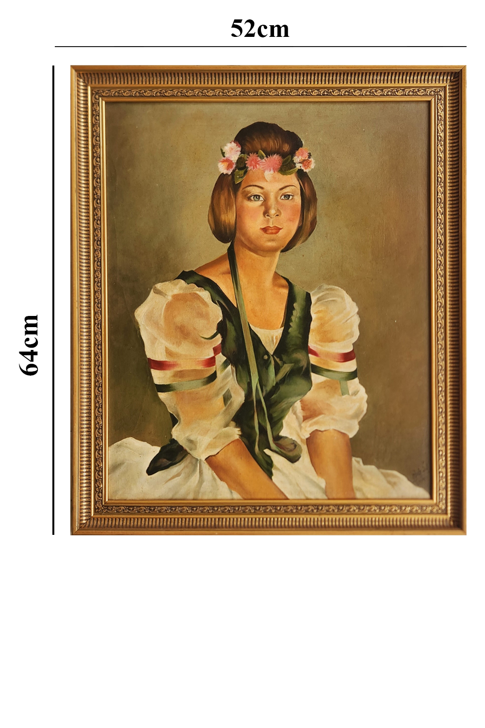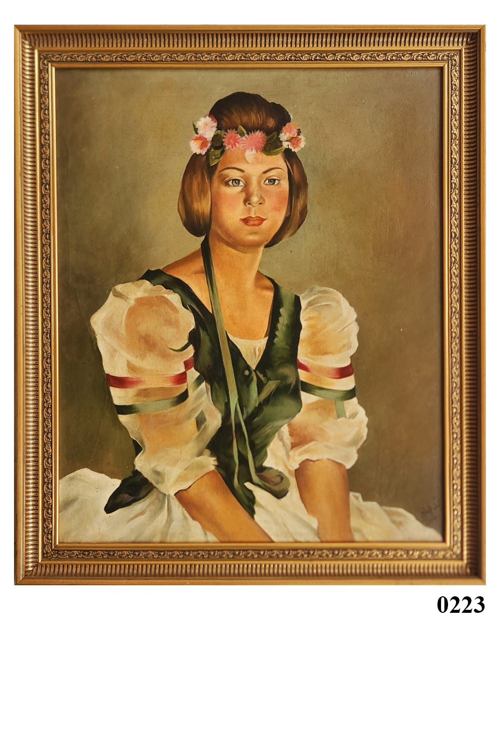 This oil painting captures the serene beauty of a young woman in traditional attire. The painting features: