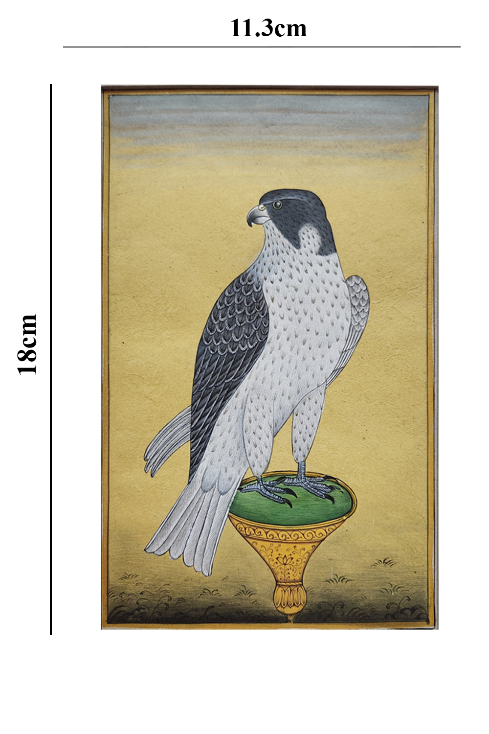 This exquisite miniature painting captures the regal presence of a falcon, meticulously rendered with fine brushwork and attention to detail. The falcon is depicted with a striking combination of white and dark feathers, standing proudly on a green and gold ornate perch. The background is a subtle gradient of yellow and gray, which enhances the focus on the bird. The painting exemplifies traditional miniature art techniques, characterized by: