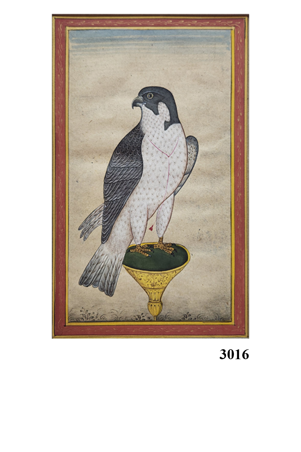 This exquisite miniature painting depicts a falcon perched majestically on a decorative stand. The artwork is characterized by its meticulous attention to detail and vibrant colors. Key features include: