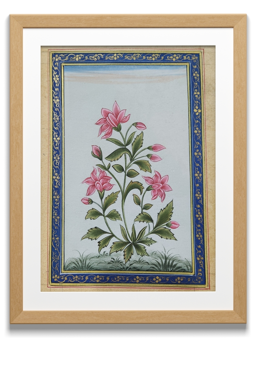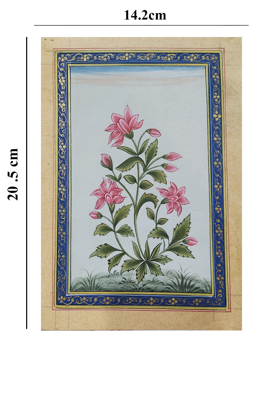 This exquisite miniature painting showcases a flowering plant with multiple pink blossoms and lush green leaves. The artwork is framed by an ornate blue and gold border, adding a touch of elegance and sophistication. The painting is characterized by: