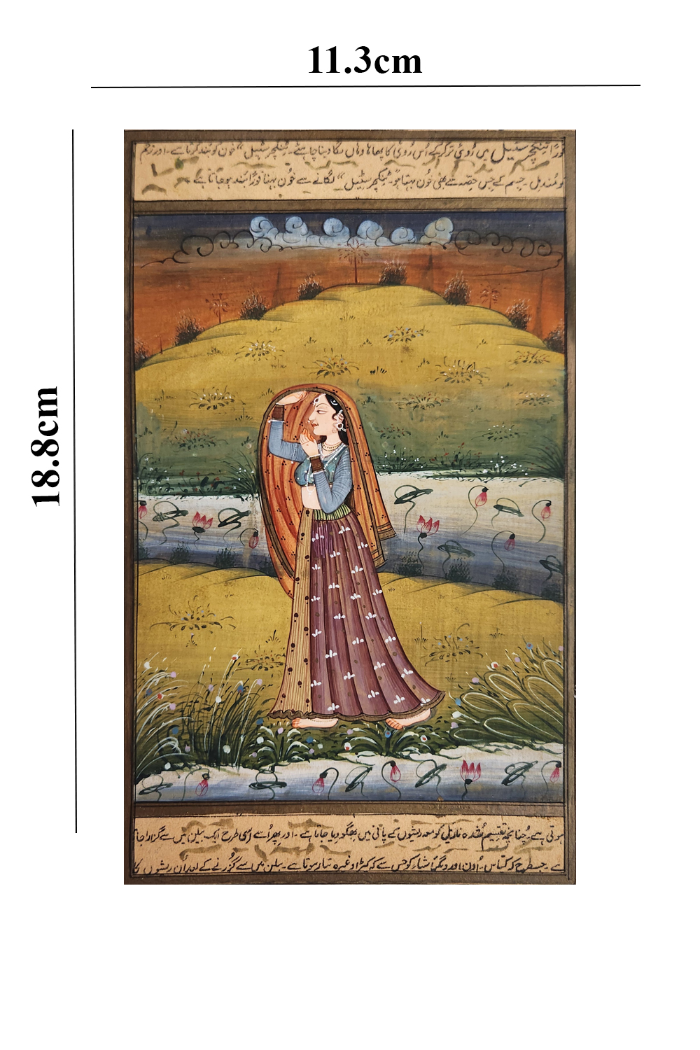 This exquisite miniature painting captures the elegance and tranquility of a lady standing by a lotus pond. The artwork is rich in detail and vibrant colors, showcasing the following features:
