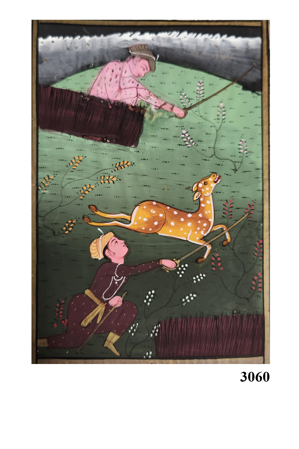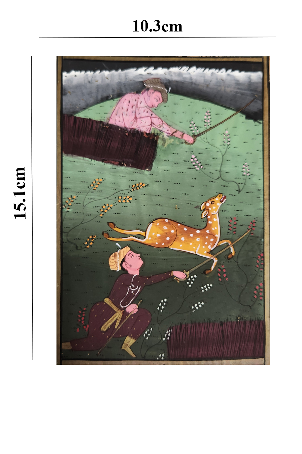 This miniature painting captures a dynamic hunting scene with intricate details and vibrant colors. The painting features: