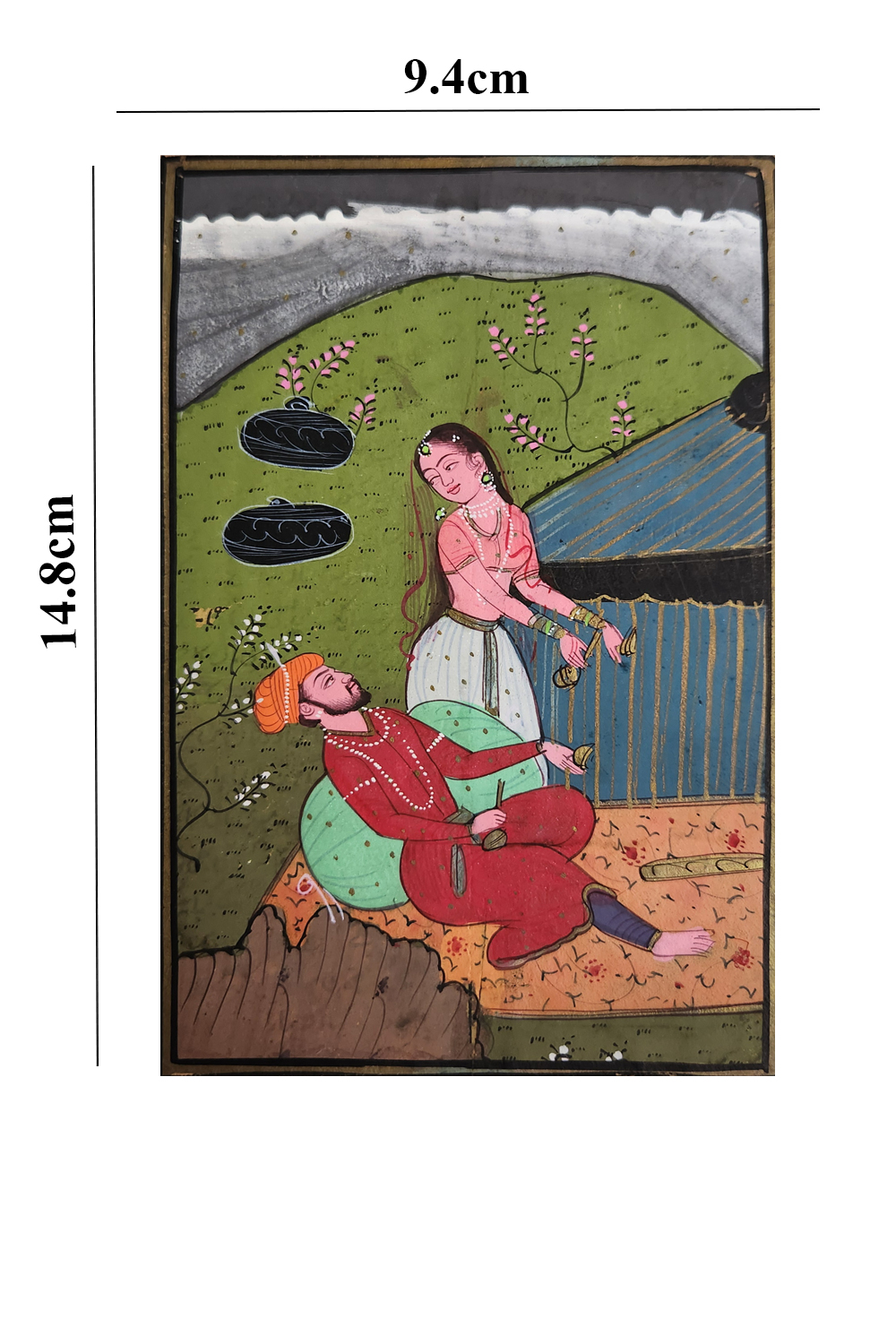 This exquisite miniature painting captures a tranquil moment in a verdant, hilly setting. The artwork features: