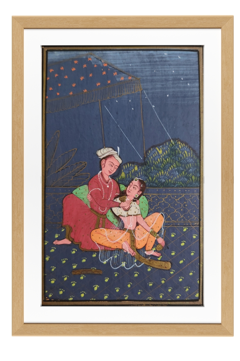 This miniature painting captures a serene and intimate scene of a royal figure and a child seated together under a starry night sky. The artwork is rich in detail and color, showcasing traditional attire and a lush background. Key features include: