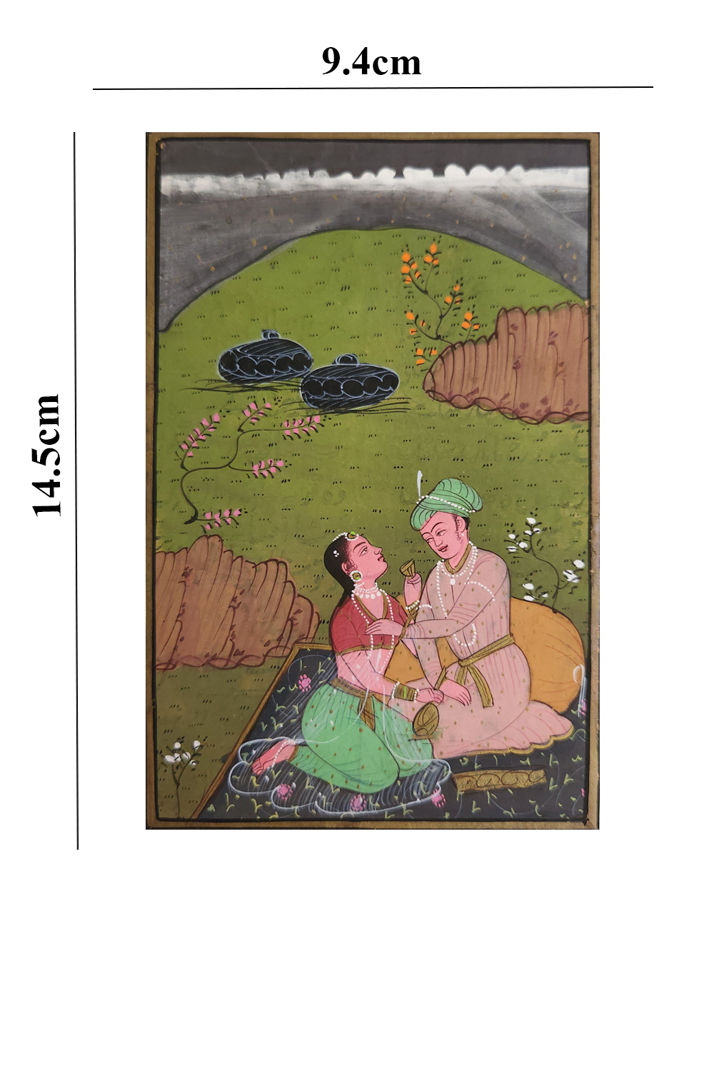 This exquisite miniature painting captures a serene and intimate scene of a royal couple seated on a mat in a verdant garden. The painting features:
