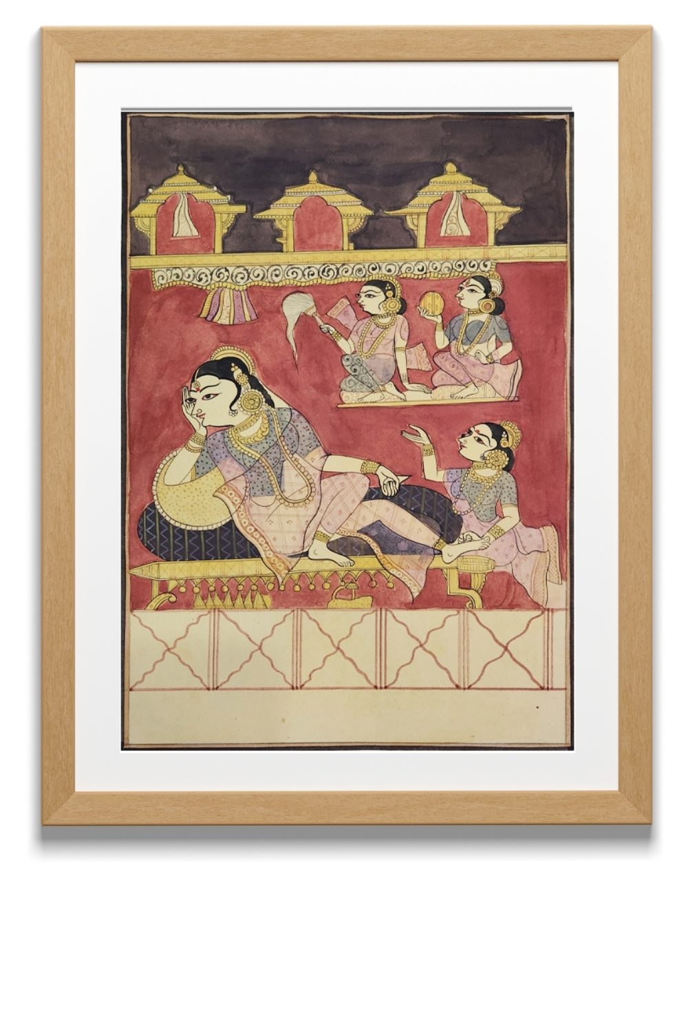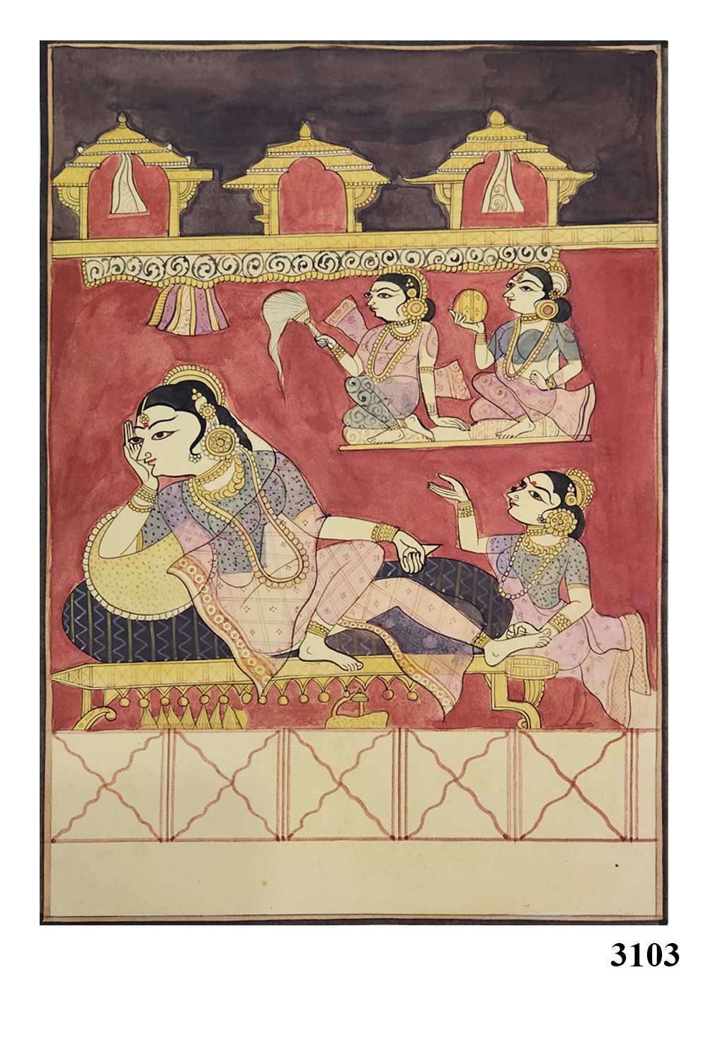 A central figure reclining on a luxurious bed, adorned in traditional attire with intricate jewelry.