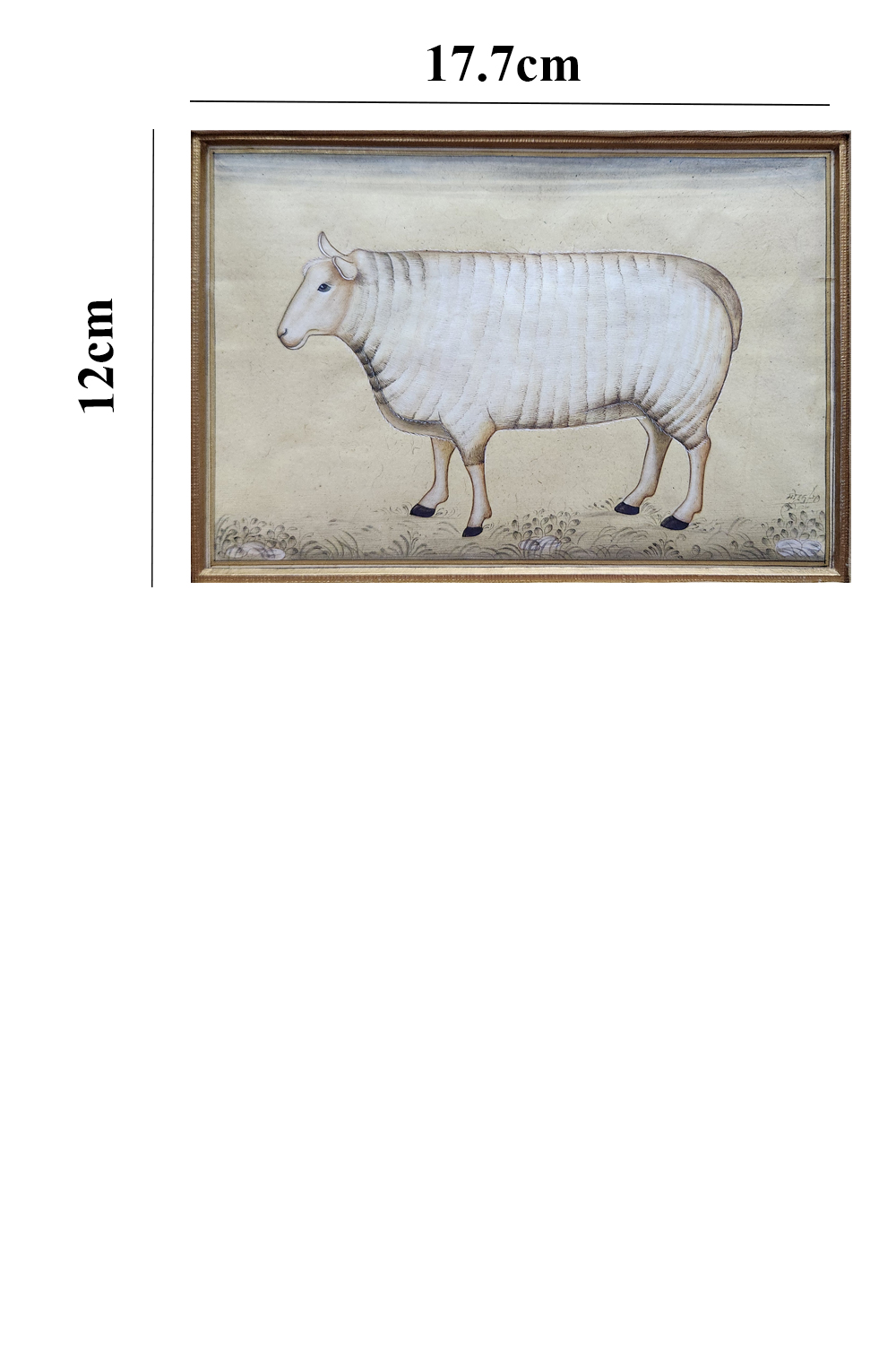 This exquisite miniature painting, titled "The Majestic Sheep," captures the serene and dignified presence of a sheep in a pastoral setting. The painting is characterized by: