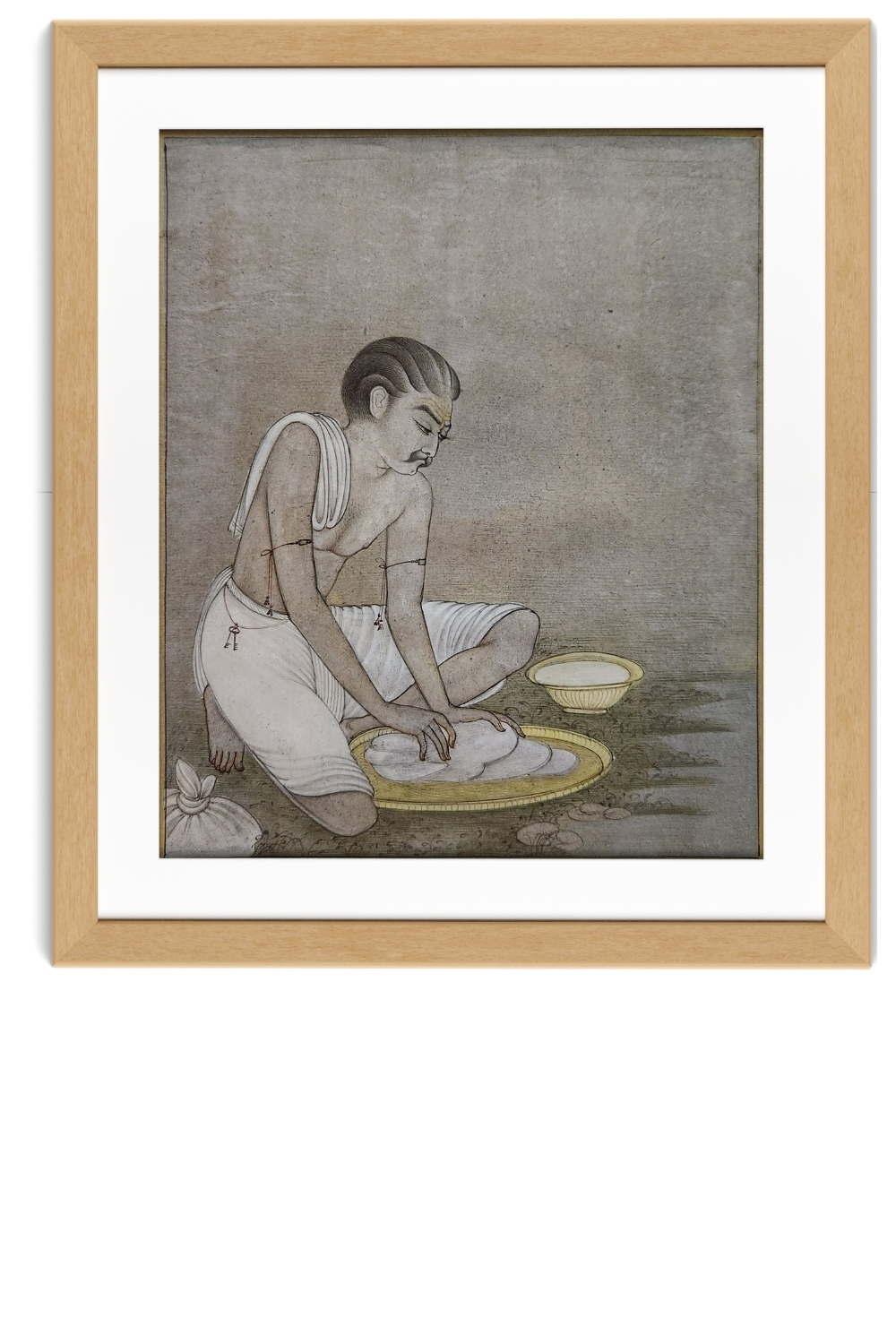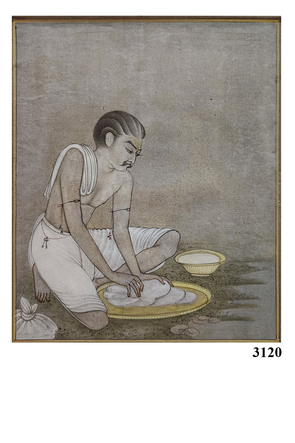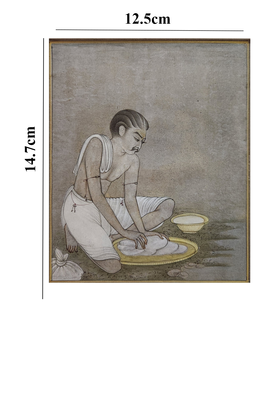 This miniature painting captures the essence of a traditional washerman engaged in his daily work. The artwork is characterized by: