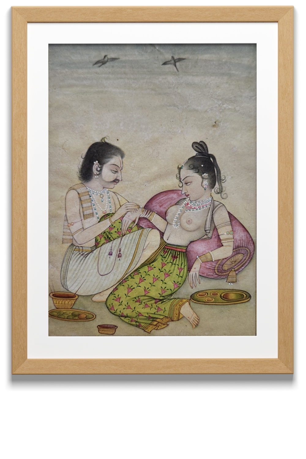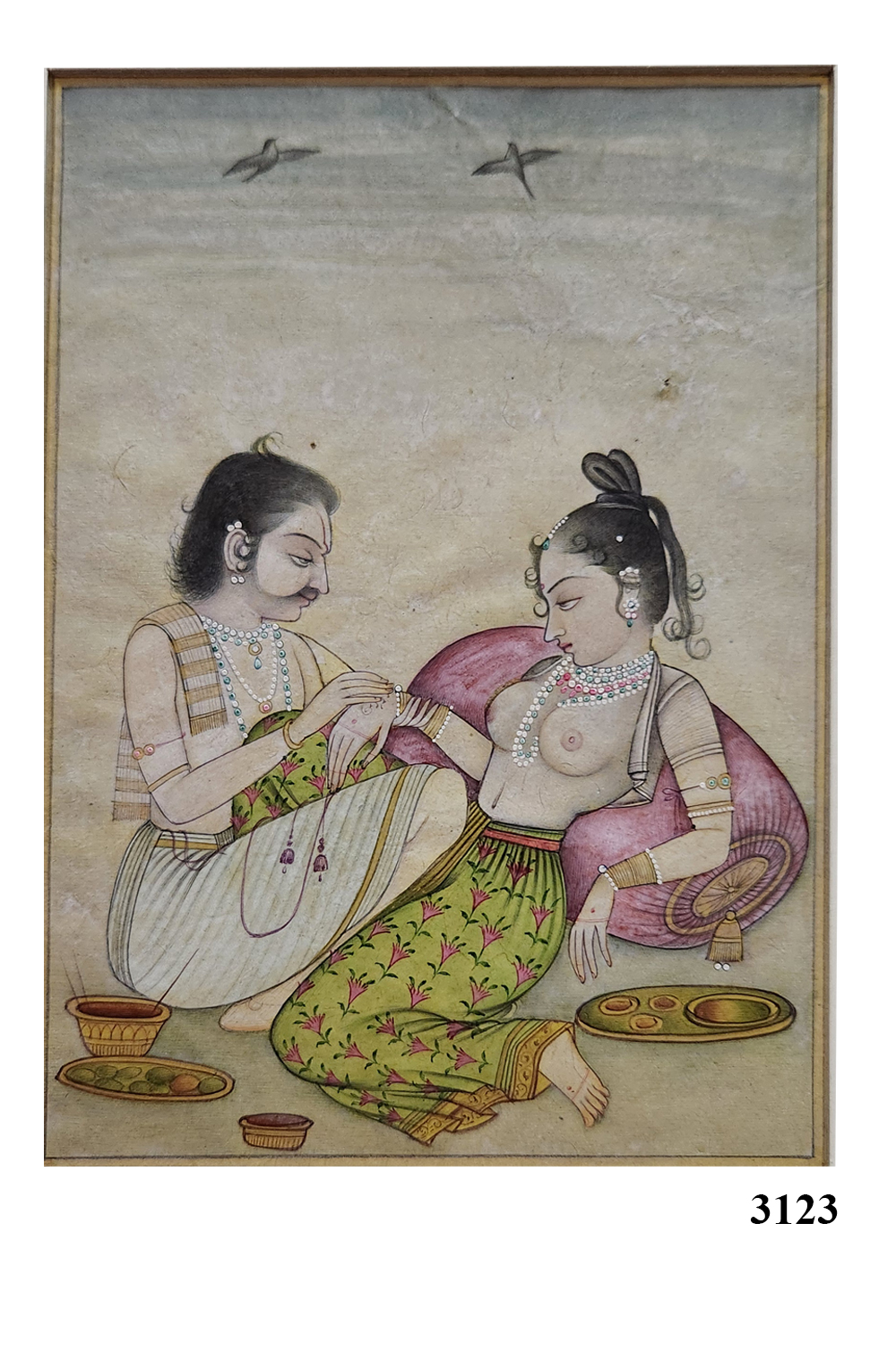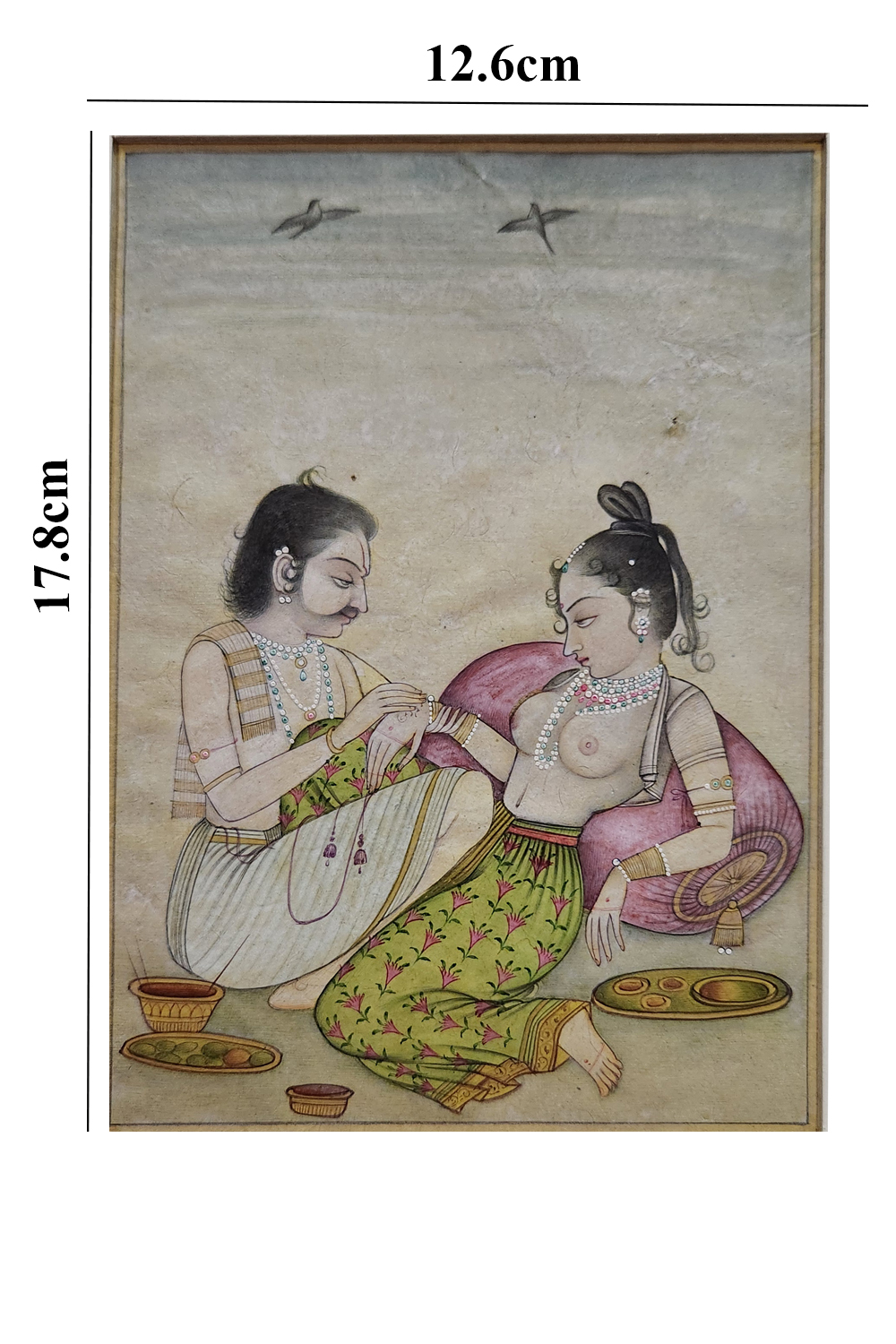 This exquisite Mughal miniature painting captures a serene and intimate moment between two figures, likely of noble or royal descent. The painting is characterized by its delicate brushwork and intricate detailing, typical of Mughal art. The figures are adorned with elaborate jewelry and traditional garments, reflecting the opulence of the era. The background features a minimalist landscape with two birds in flight, adding a sense of tranquility to the scene. The use of vibrant colors and fine lines highlights the artist's skill and attention to detail.