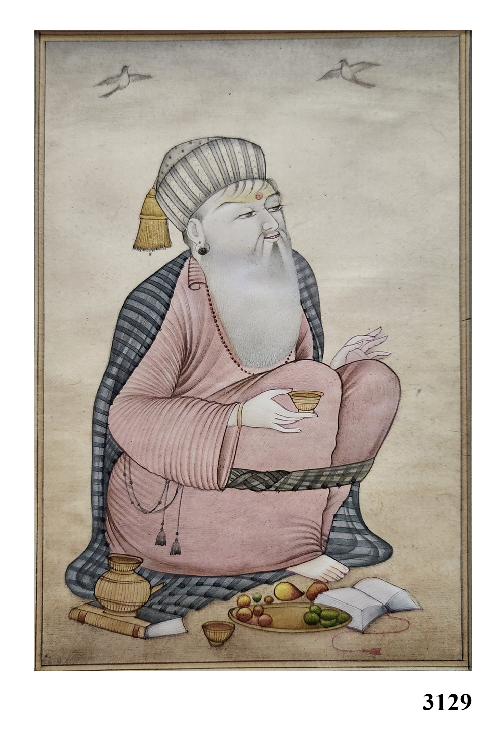 This exquisite miniature painting portrays a sage seated in a contemplative pose, holding a cup. The sage is adorned in a pink robe with intricate patterns and a striped shawl draped over the shoulders. The background is minimalistic with two birds flying, adding a serene ambiance. The sage is surrounded by various objects, including a book, fruits, and a vessel, symbolizing knowledge and sustenance. The painting is rich in detail and captures the essence of tranquility and wisdom.
