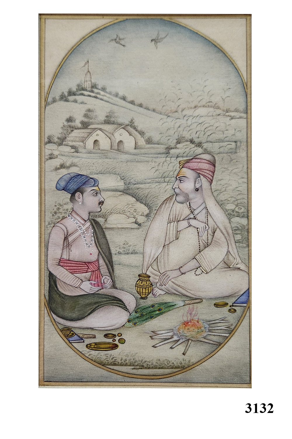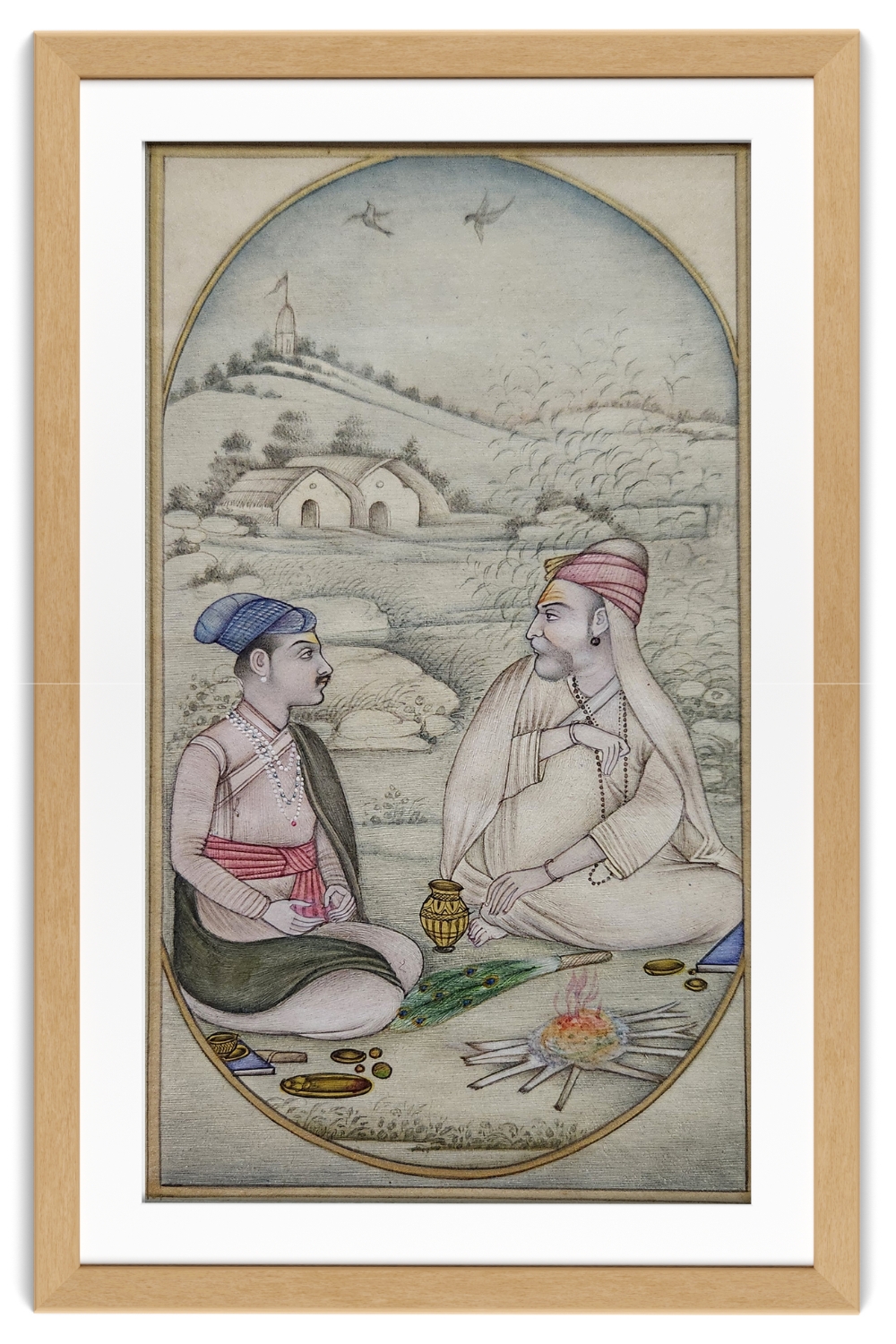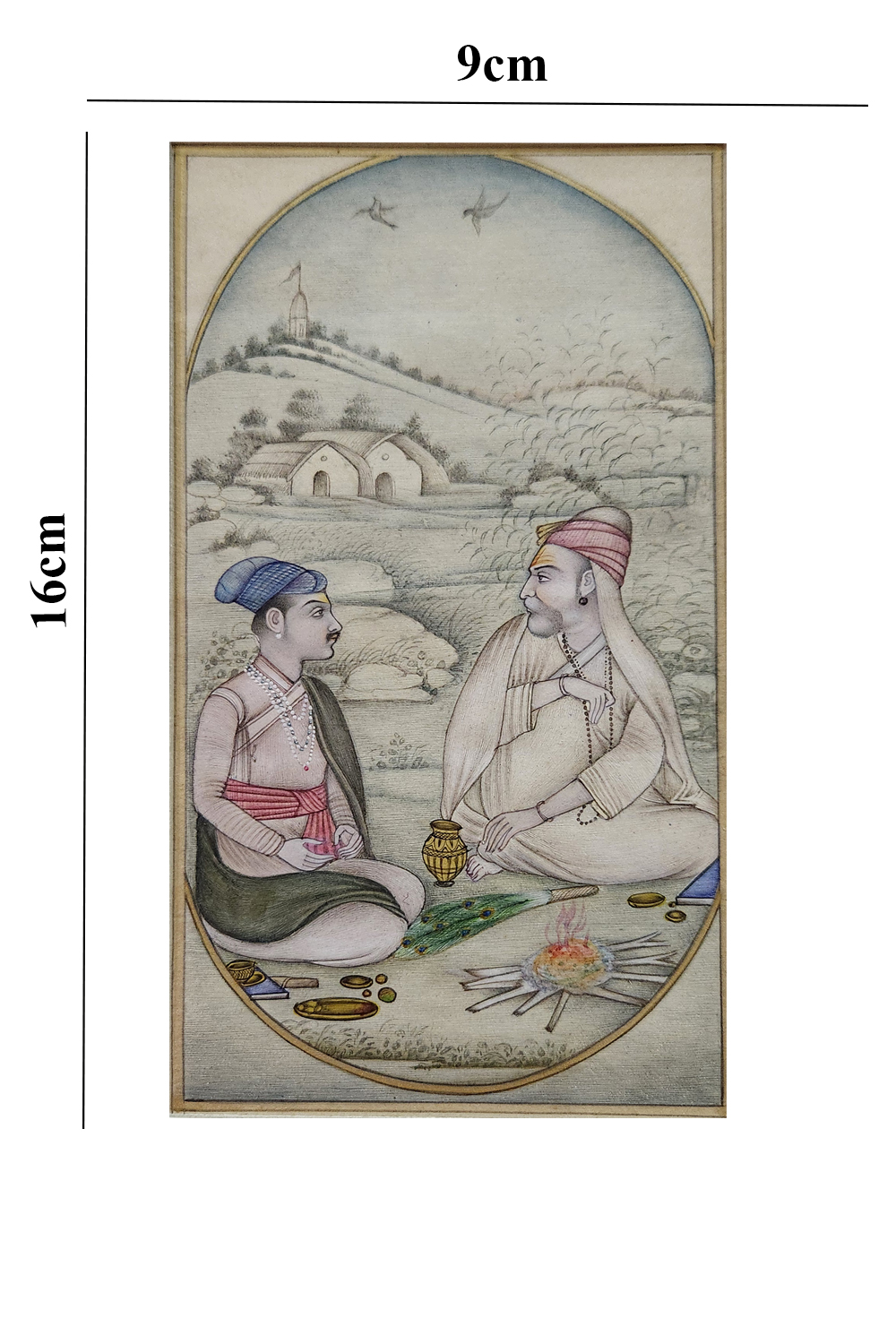This exquisite miniature painting captures a tranquil scene of two individuals seated on the ground, engaged in a conversation by a small fire. The background features a picturesque landscape with rolling hills, trees, and a distant structure, possibly a temple or house, adding depth to the scene. The individuals are adorned in traditional attire, with intricate details in their clothing and accessories, highlighting the artist's meticulous attention to detail. The use of soft, muted colors and delicate brushwork enhances the serene and contemplative mood of the painting. The composition is framed within an arched border, drawing the viewer's eye towards the central figures and the intimate moment they share.