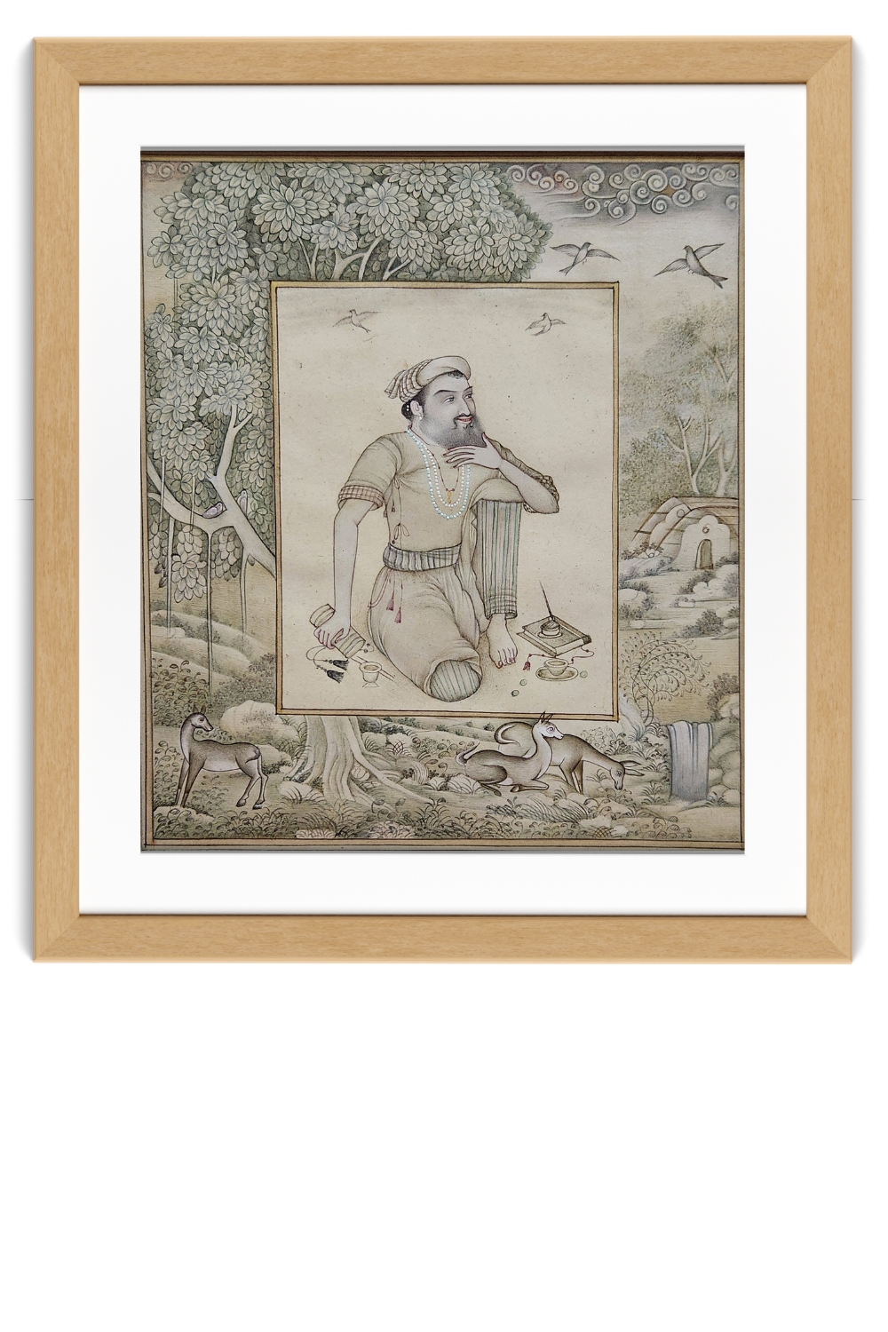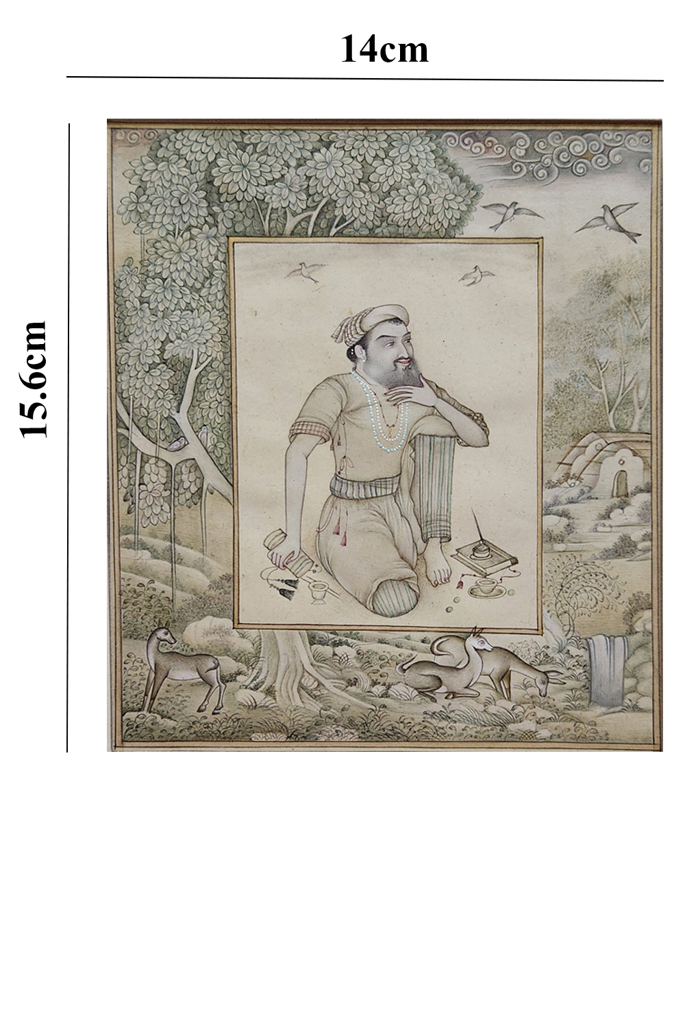 This exquisite miniature painting portrays a sage in deep meditation, set against a backdrop of a verdant forest. The sage is seated under a tree, with a serene expression, holding a rosary in one hand and a bowl in the other. The painting features intricate details such as the sage's traditional attire, adorned with beads and a headscarf. Surrounding the sage are various elements of nature, including birds flying in the sky, a deer grazing, and a pair of foxes resting nearby. The background also includes a small hut and a waterfall, adding to the tranquil ambiance. The use of muted colors and fine brushwork highlights the delicate and peaceful nature of the scene.