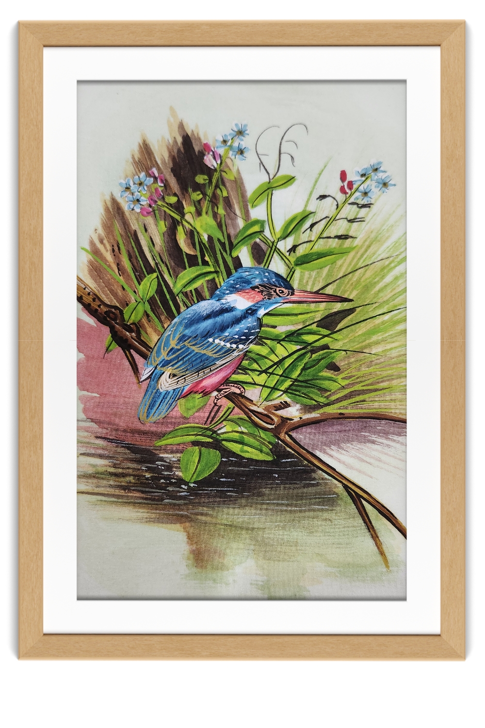 This exquisite water painting captures the serene beauty of a kingfisher in its natural habitat.