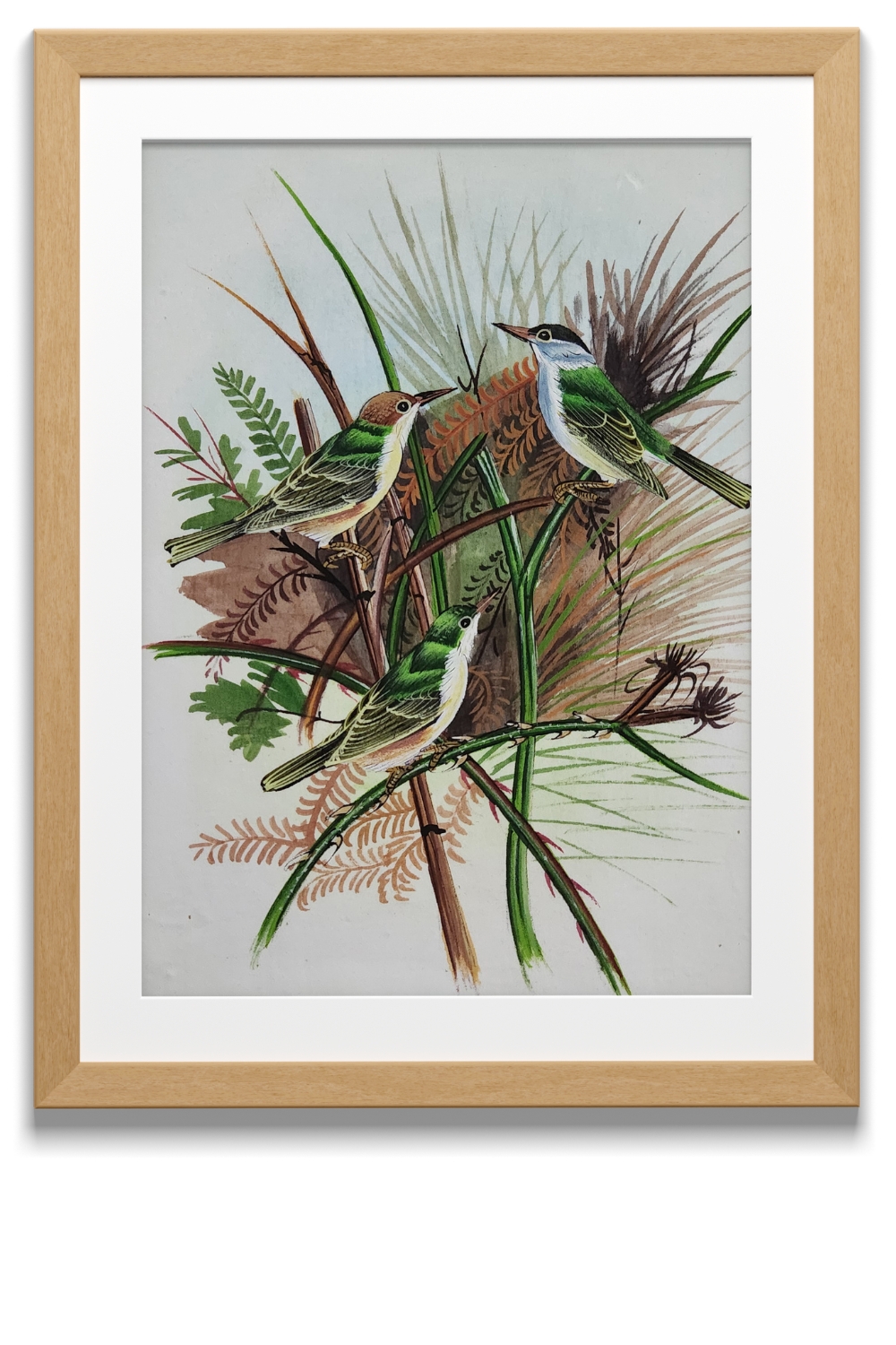 Birds perched on slender branches amidst a backdrop of ferns and grasses.