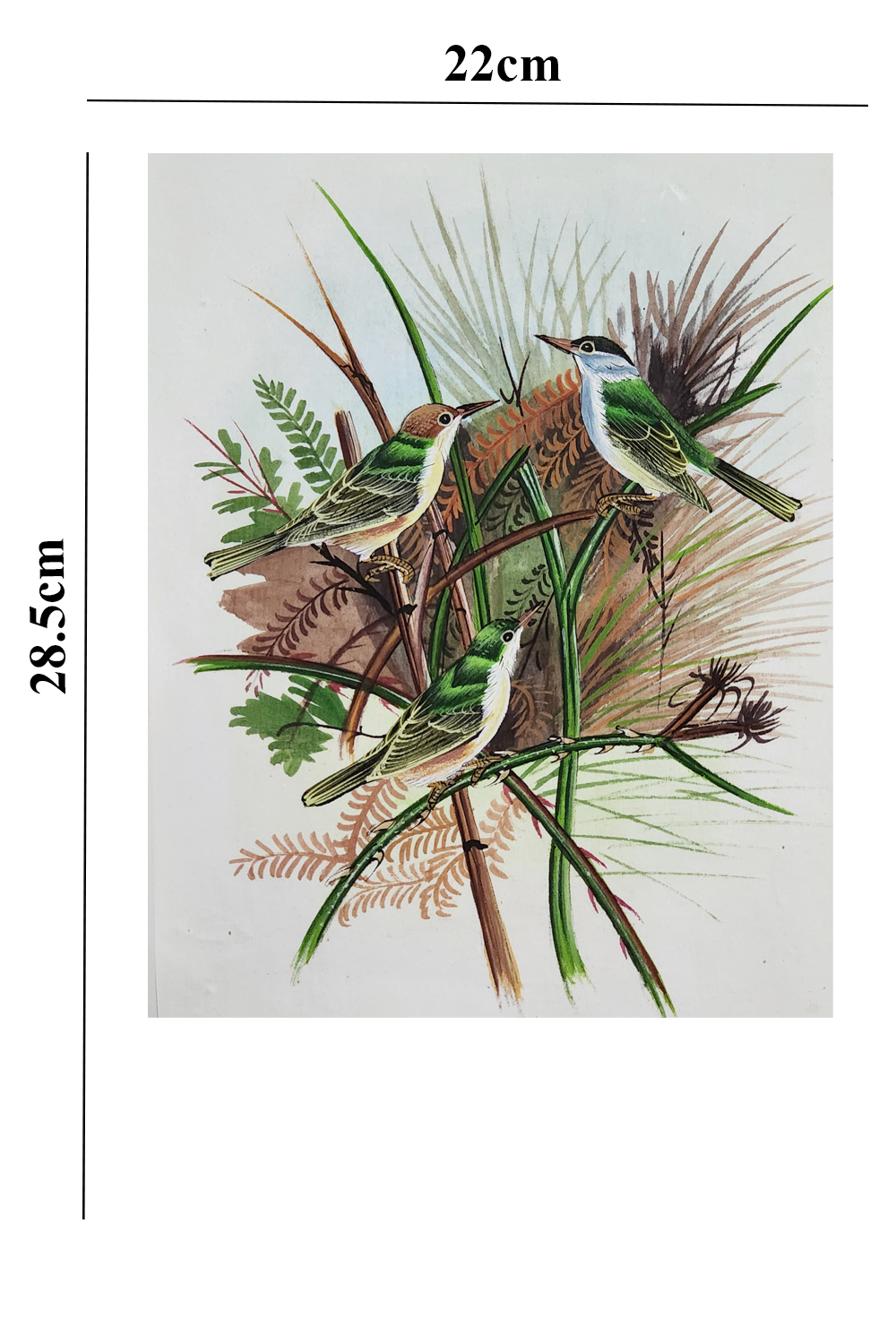 This watercolor painting captures the serene beauty of nature with three green-backed birds as the focal point. The painting features: