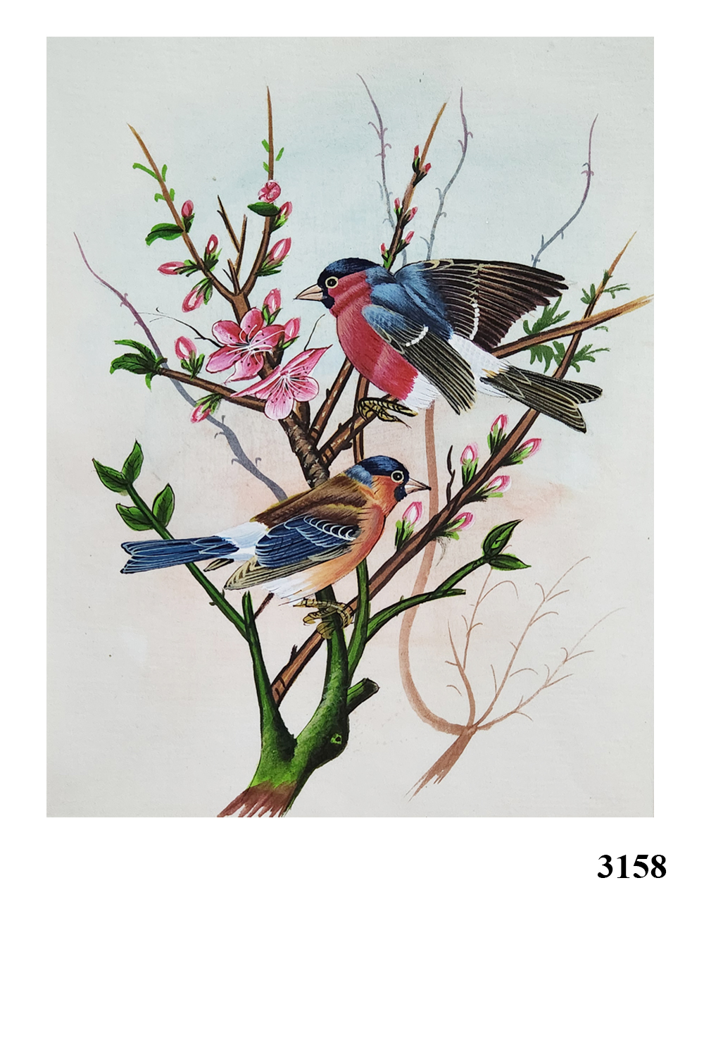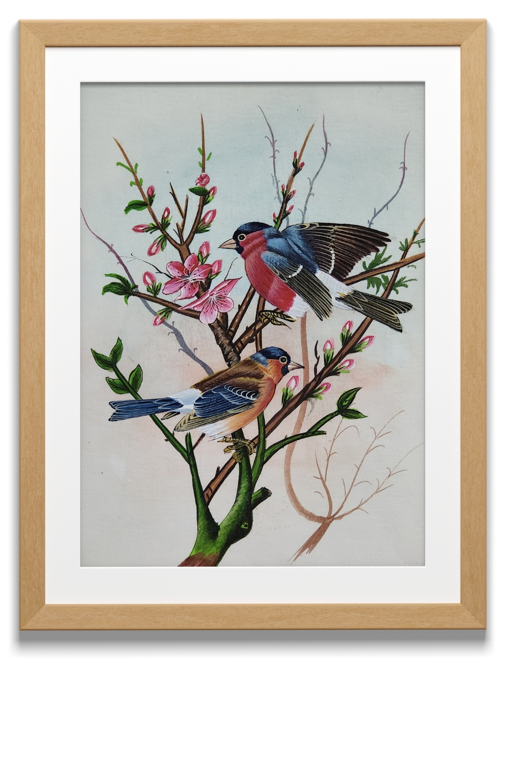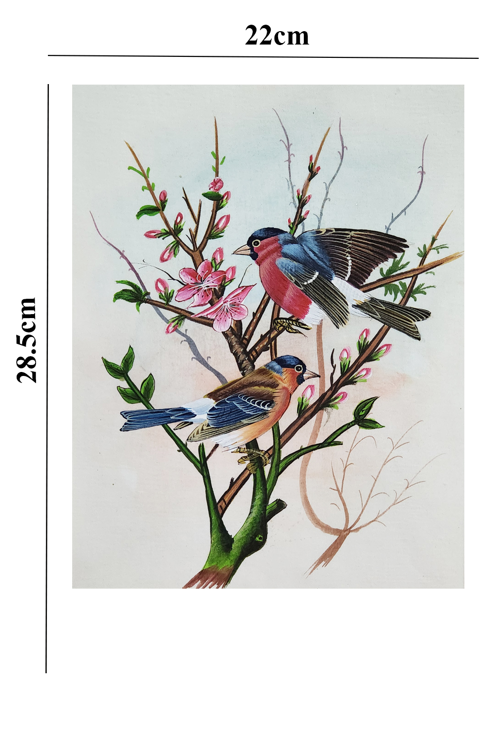 This exquisite watercolor painting captures the essence of spring with two beautifully detailed birds perched on a blossoming tree branch.