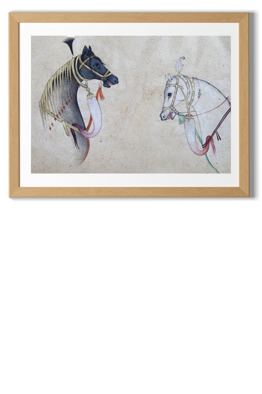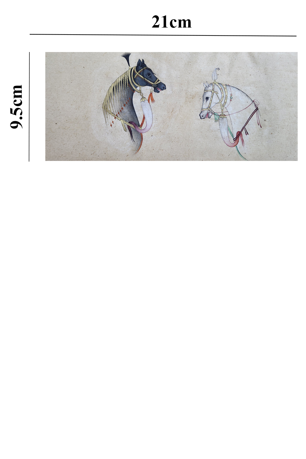 This exquisite miniature painting captures a serene moment between two horses, each adorned with intricate bridles and decorative elements. The painting features: