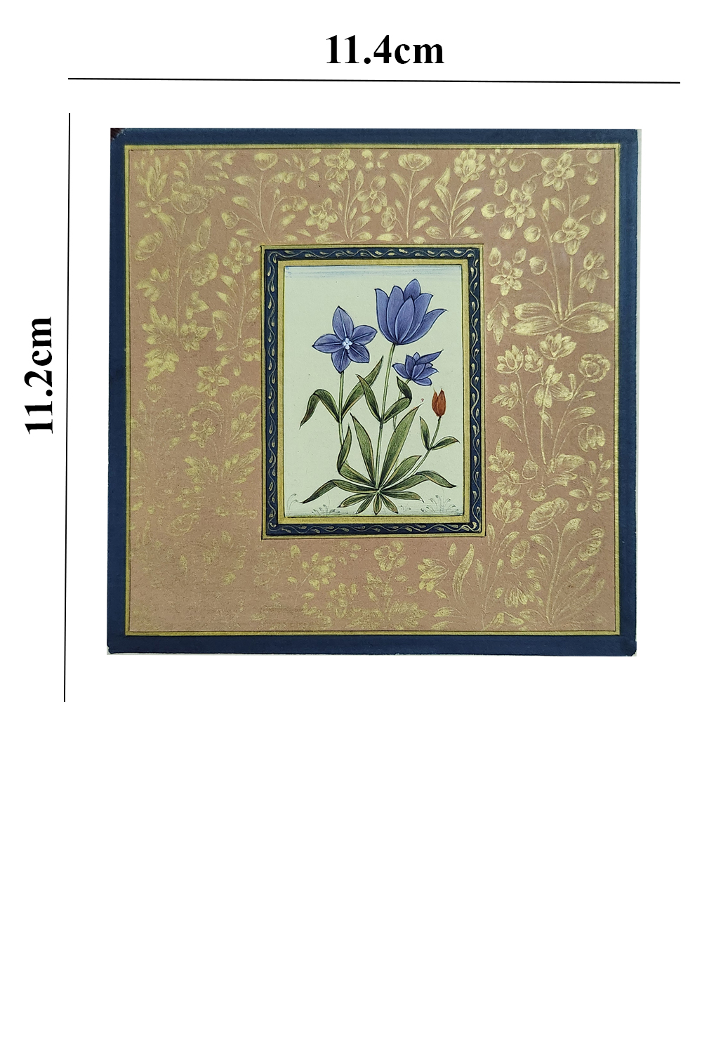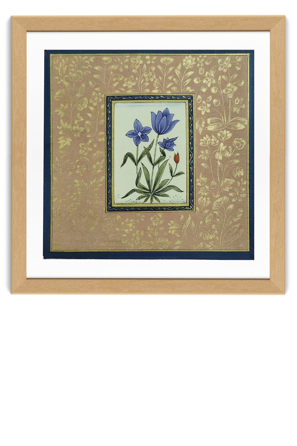 This exquisite miniature painting captures the elegance of nature with its detailed depiction of blue flowers. The painting is characterized by: