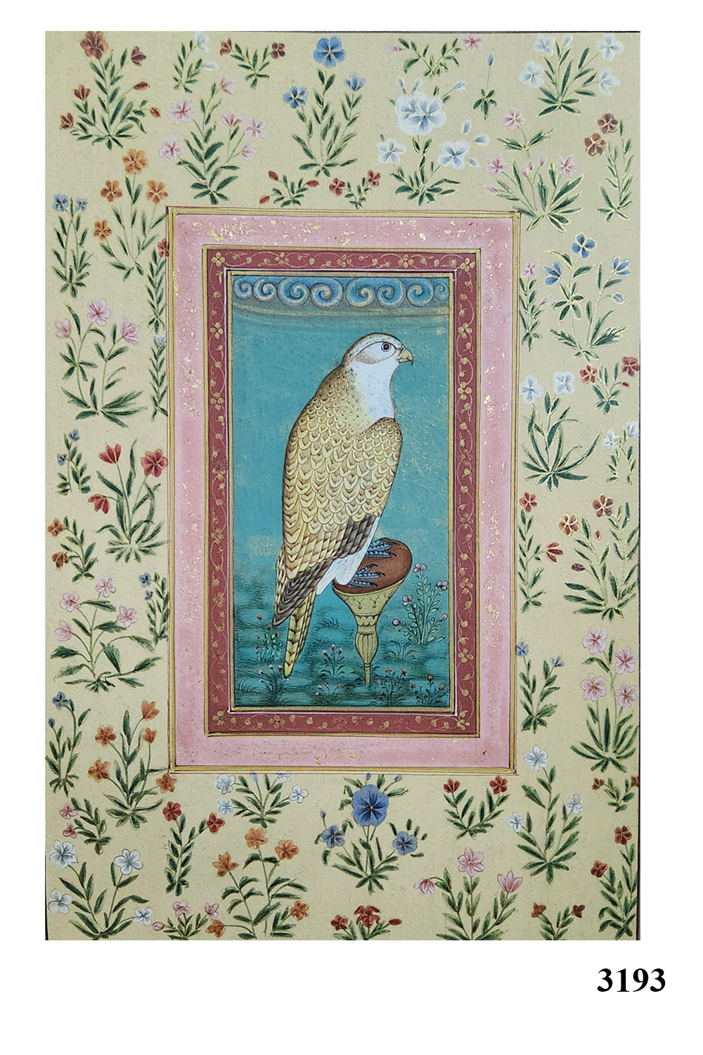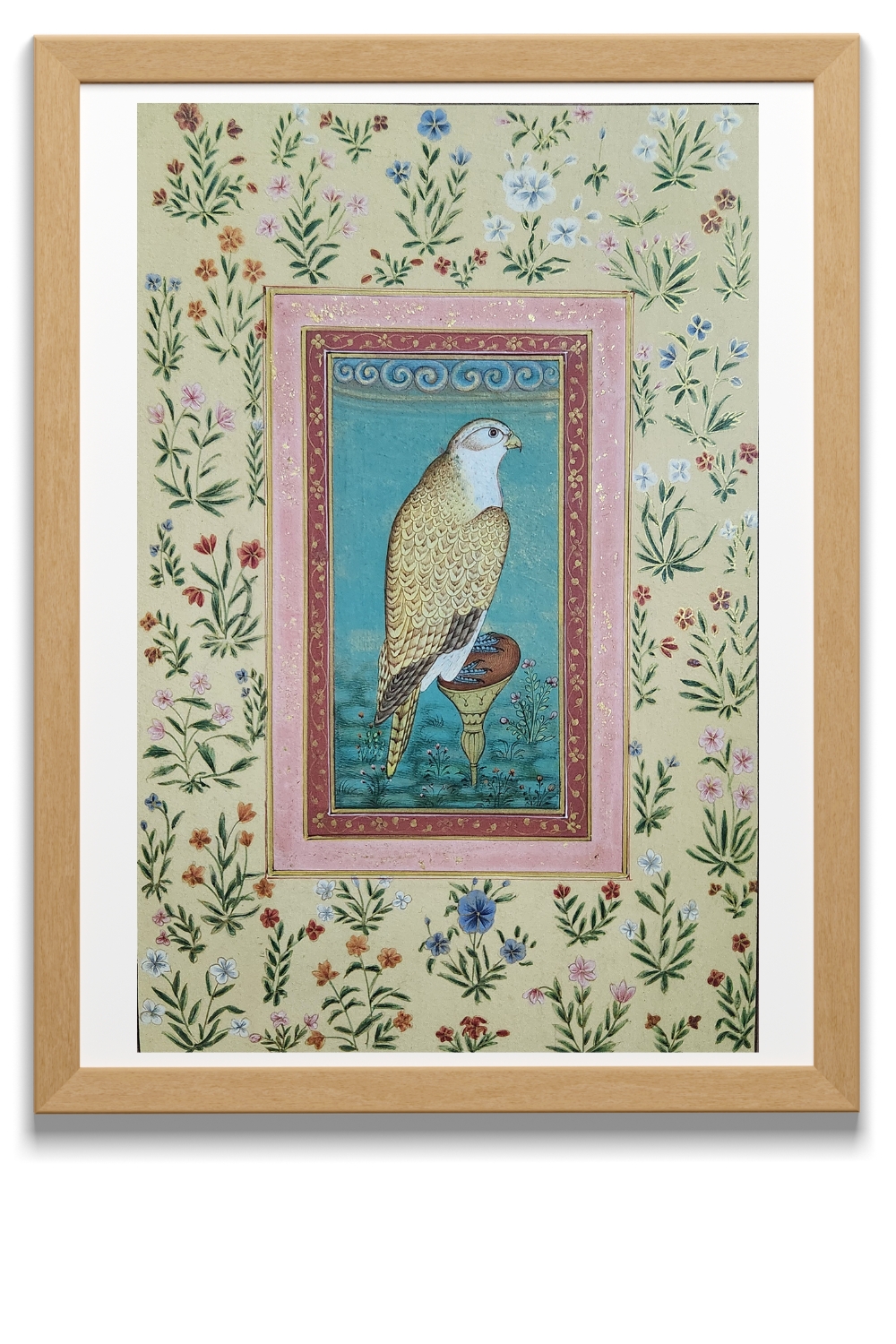 This exquisite miniature painting showcases a regal falcon perched on a stand, set against a serene blue background. The painting is framed by an intricate border with pink and gold accents, adding a touch of elegance. The outermost border is adorned with a variety of delicate flowers and foliage, showcasing the artist's attention to detail and mastery of botanical illustration. The falcon itself is meticulously rendered, with fine detailing on its feathers and a proud, watchful expression. The use of vibrant colors and intricate patterns makes this painting a captivating piece of art.