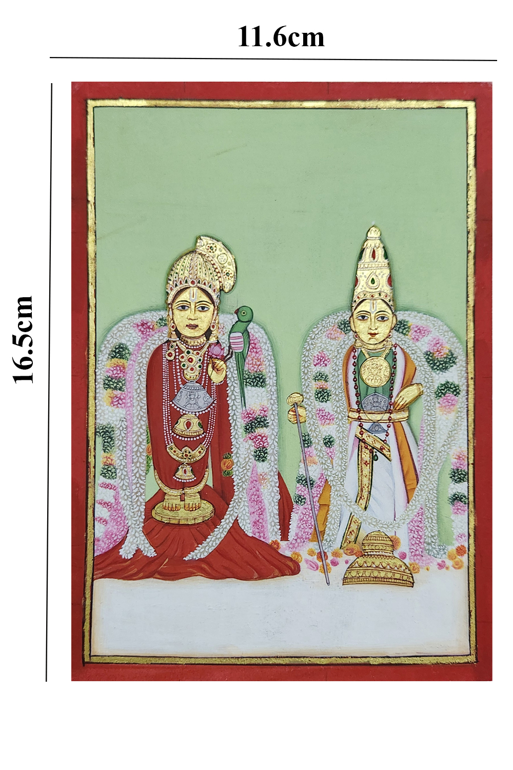 This exquisite miniature painting depicts a divine couple adorned in traditional attire and elaborate jewelry, seated against a lush green background. Intricate floral garlands drape around them, showcasing the rich cultural heritage and artistic finesse of traditional Indian miniature art. Elevate any space with this timeless piece of art, perfect for adding a touch of cultural richness and elegance to your home or office. Ideal for art enthusiasts and collectors alike, "Divine Couple" is a testament to the intricate wonders of traditional Indian art, captured through meticulous craftsmanship and artistic vision.
