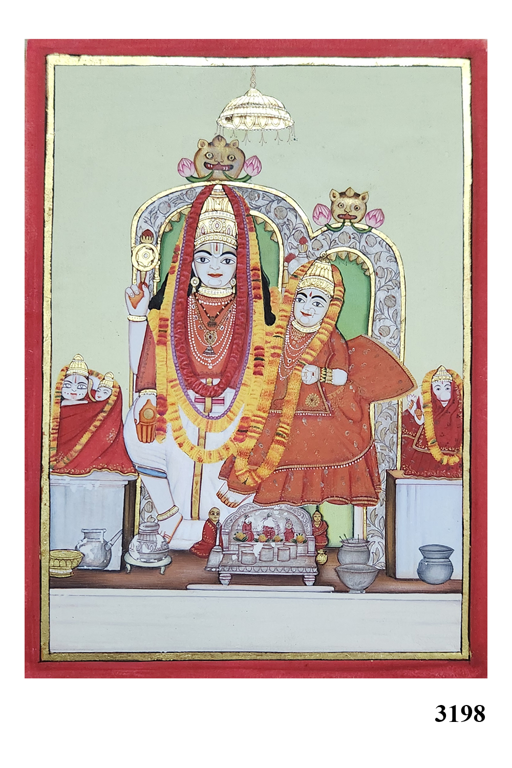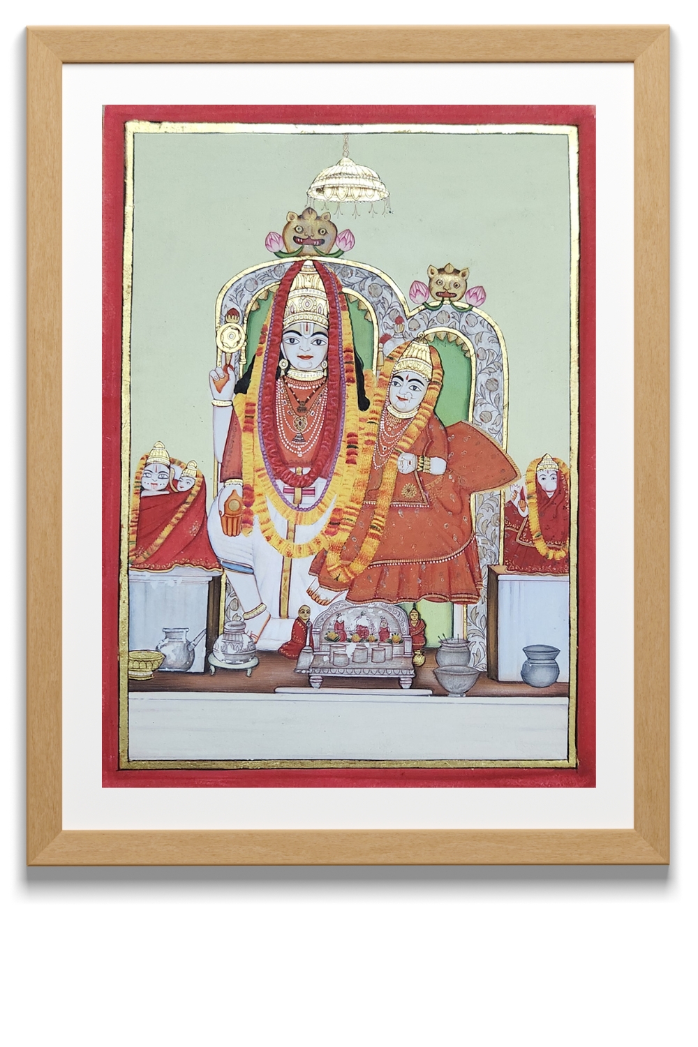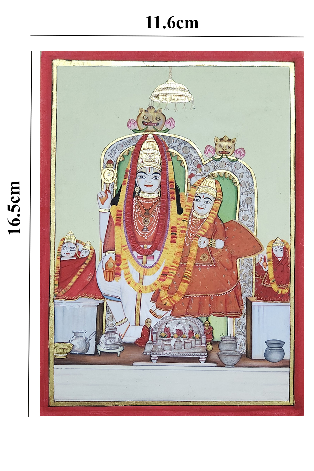 "Divine Couple in Traditional Attire" captures the regal essence of a divine couple, possibly representing deities, standing together with attendants on either side. The central figures are adorned with elaborate garlands, jewelry, and traditional clothing, highlighting their divine and regal nature. The background includes intricate architectural elements and decorative motifs, adding depth and context to the scene. Hand-painted using natural pigments and gold leaf on paper, the artwork reflects the rich cultural and religious heritage of Rajasthan.