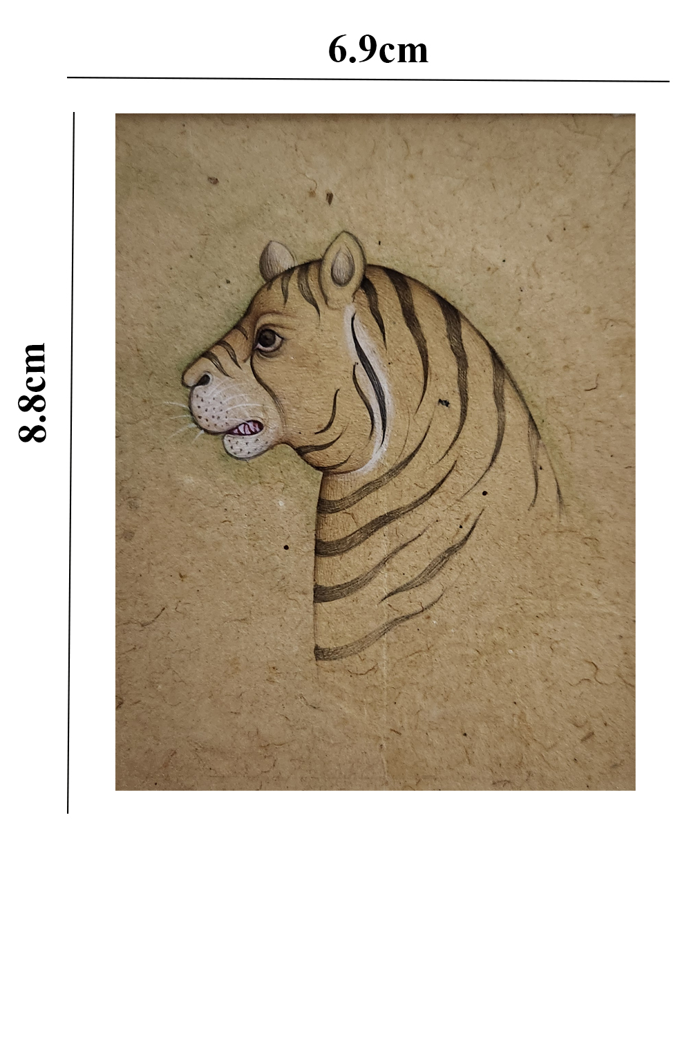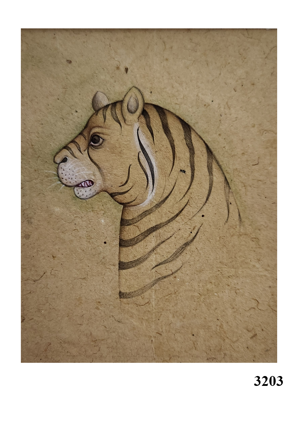 Product Content in Details: Majestic Tiger Profile showcases the regal essence of the tiger, a symbol of power and courage. The tiger is depicted in precise detail, with its distinctive stripes, sharp gaze, and strong jawline rendered meticulously. The earthy-toned background complements the subject, giving the painting an antique and traditional feel. Created using natural pigments and traditional miniature painting techniques, this artwork represents the rich artistic heritage of Rajasthan.