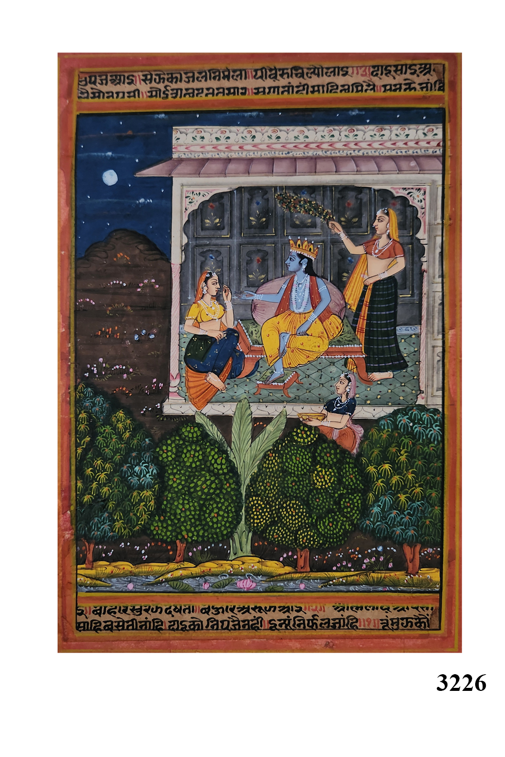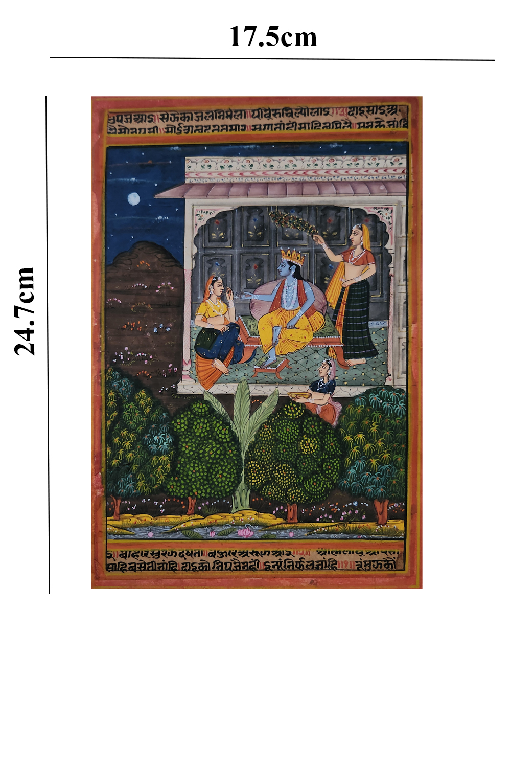 Krishna’s Enchanted Melody is a stunning miniature painting that captures the celestial harmony between Lord Krishna and his devoted Gopis. Seated gracefully amidst nature’s tranquility, Krishna plays his flute, enveloping the scene in an aura of serenity and divine love. Each figure is rendered with meticulous detailing, from the delicate expressions of the Gopis to the ornate embellishments on Krishna’s attire. The ethereal moonlit backdrop and lush greenery enhance the spiritual charm of the composition, making it a timeless addition to any collection. Traditional script embellishes the borders, adding a cultural and historical dimension to the artwork. Please note that the frame shown is for visual representation only and is not included in the price.