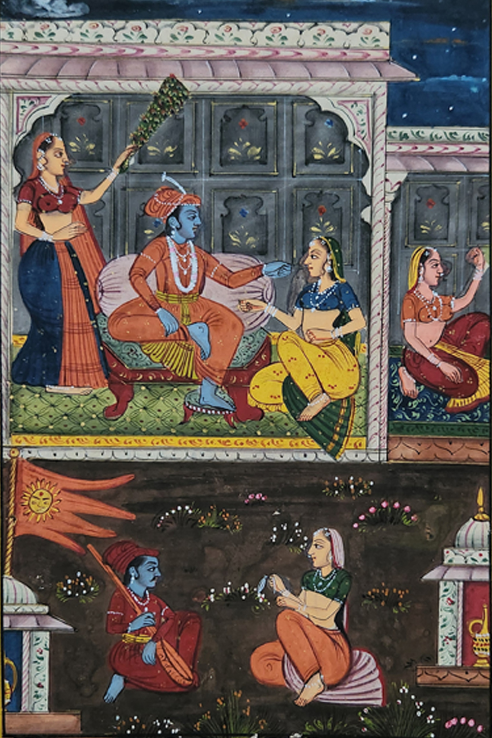 - Dual Composition: The painting beautifully integrates two distinct yet harmonious portrayals of Krishna.