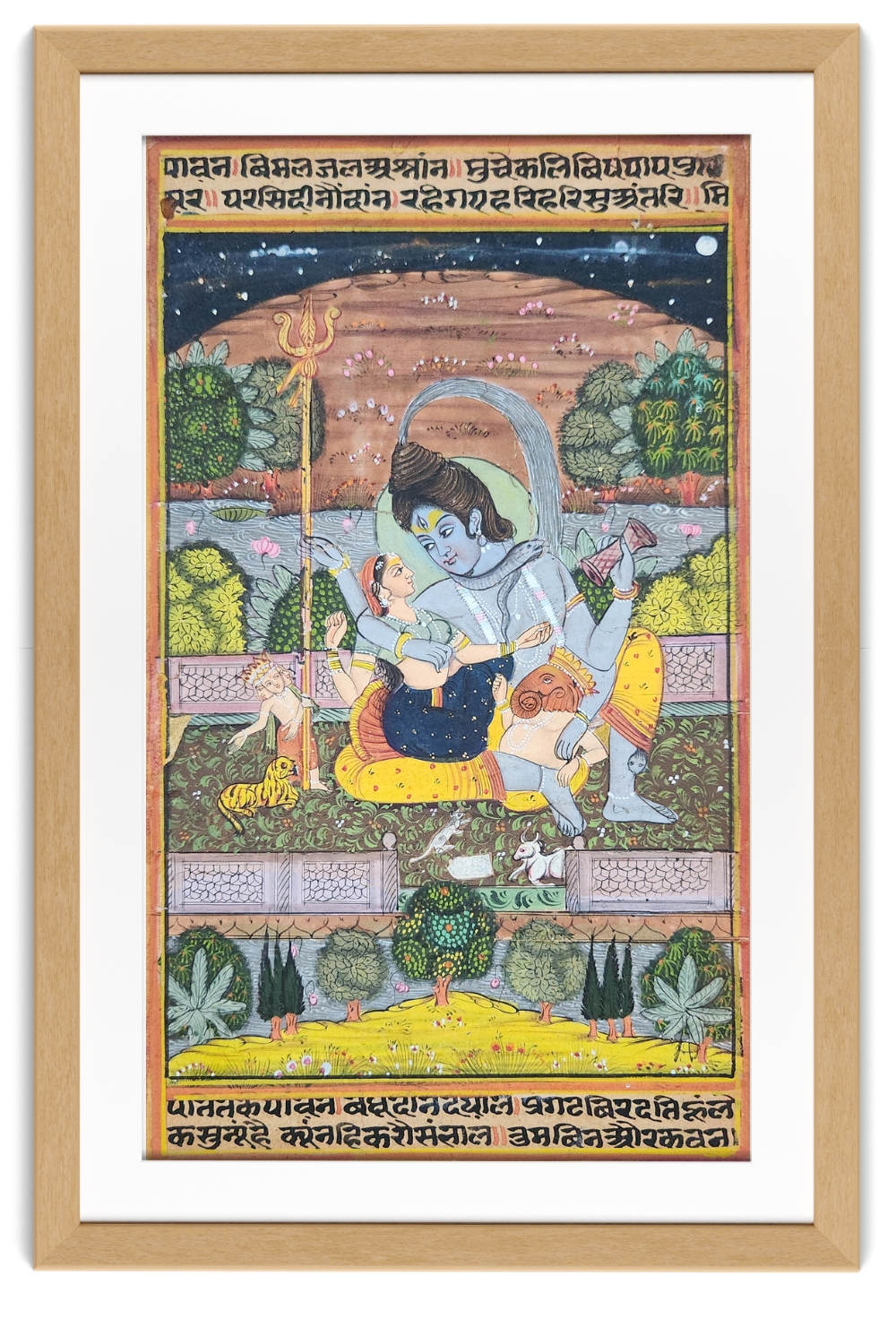 Traditional Indian miniature painting inspired by divine Hindu iconography