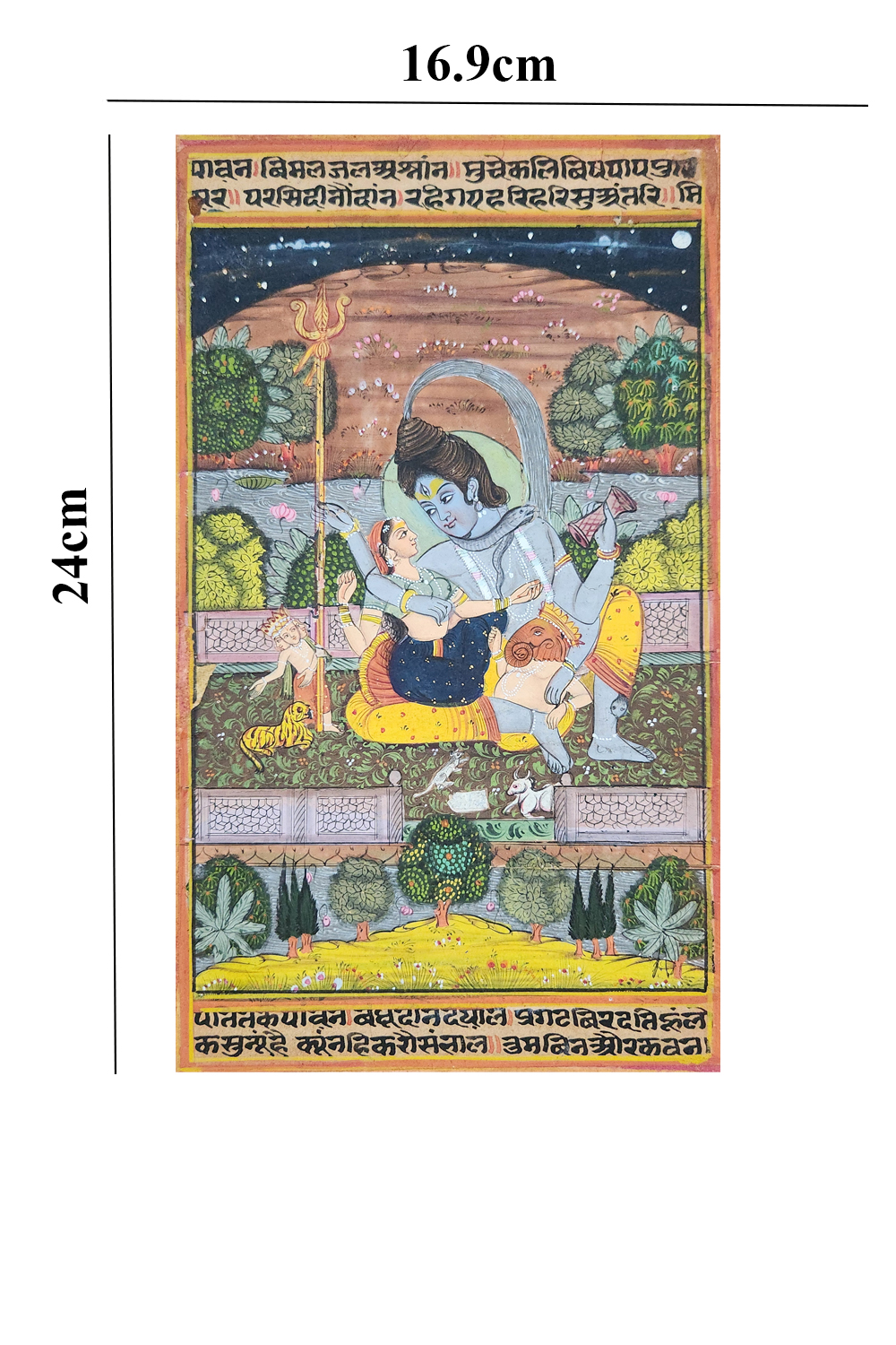 Shiva Parvati – Divine Embrace in Kailash is a stunning miniature artwork rooted in Hindu mythology and love symbolism. The scene depicts Lord Shiva tenderly holding Parvati in a moment of celestial affection, seated on a tiger skin throne amidst nature's lush beauty. With the crescent moon overhead and Mount Kailash in the background, the composition evokes tranquility and spiritual harmony. Shiva’s iconic attributes—the crescent moon, flowing Ganga, and trident—are intricately detailed, while Parvati's graceful posture adds softness and balance to the composition. Surrounded by dense flora, lotus blooms, and vibrant gardens, this painting beautifully captures divine love and balance between masculine and feminine energies. Sanskrit verses at the top and bottom lend it spiritual depth and authenticity.