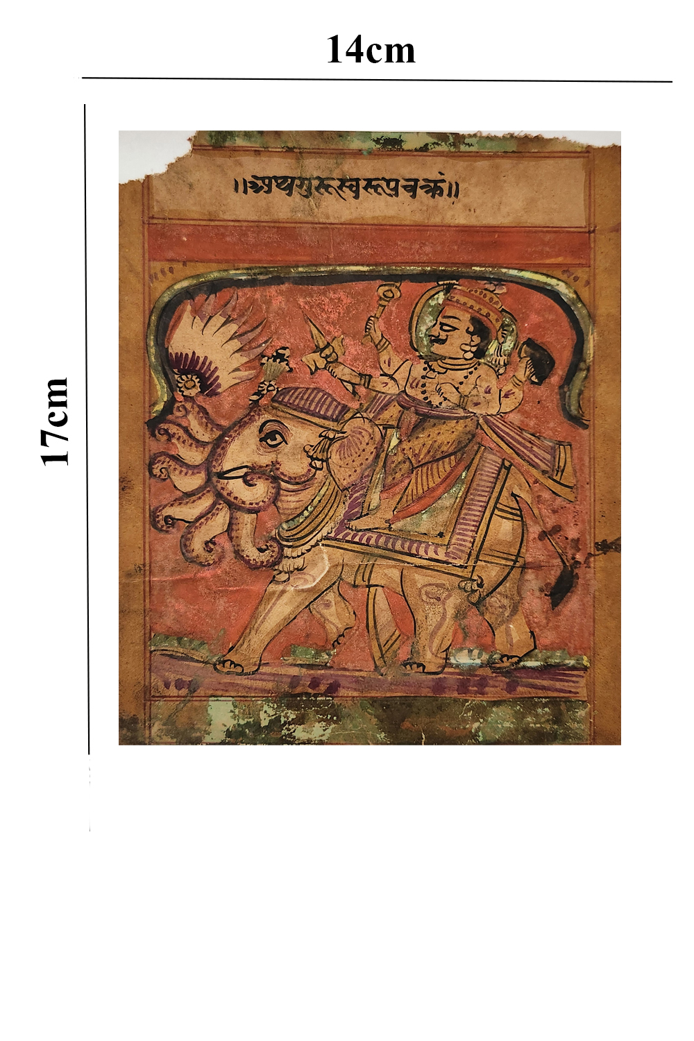 Product Content: This exquisite miniature painting celebrates the grandeur and power of Lord Indra, the ruler of the heavens, as he rides his sacred elephant, Airavata. Crafted with meticulous detail, the painting captures the regal presence of Indra, adorned with traditional ornaments and a majestic crown, holding a lotus and vajra (thunderbolt), symbolic of his divine authority. Airavata, depicted with intricate embellishments, stands as a noble and revered creature, exuding strength and grace. The rich color palette, delicate brushwork, and ornate patterns reflect the finest traditions of Indian miniature art, making this piece an exceptional collector’s item. The backdrop, possibly hinting at divine realms, complements the sense of cosmic grandeur, ensuring the painting embodies both artistic finesse and mythological significance.