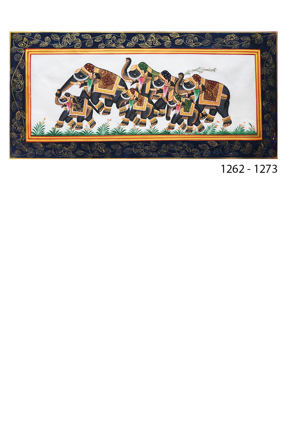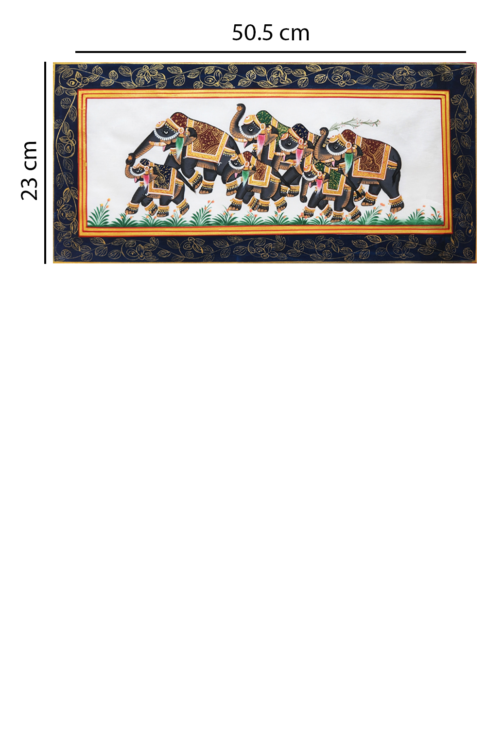 Royal Harmonies brings to life a ceremonial procession of elephants, rendered with majestic rhythm and cultural finesse on a smooth silk canvas. Each elephant, bedecked in elaborate coverings and regal finery, marches with quiet dignity, while the riders—dressed in traditional attire—evoke tales of royal grandeur. The painting’s vibrant composition is framed by an intricate blue floral border enriched with golden accents, further enhancing its royal charm. Painted entirely with original mineral colors, this piece carries a legacy of craftsmanship, where each brushstroke is steeped in cultural memory. Compact yet powerful in narrative, this artwork is perfect for collectors seeking authentic heritage and timeless beauty in a slim format.