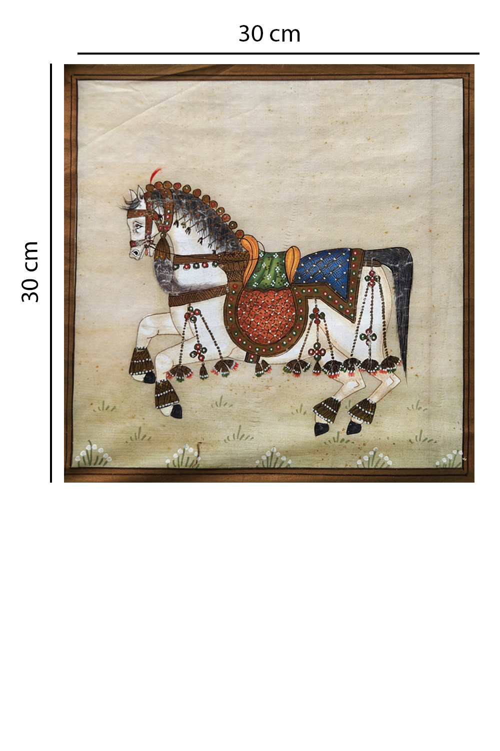 The Royal Sentinel captures the poised elegance of a ceremonial horse, rendered with precision and reverence on fine silk. Standing in regal composure, the horse is lavishly dressed in traditional finery—ornate saddlecloths, gilded harnesses, and richly detailed trappings, each element painted with care using original mineral colors. The painter’s attention to anatomical grace and fabric layering breathes life into the composition, while the square format lends it a balanced, contemplative presence. The minimal background draws the viewer’s focus onto the horse’s proud stance, echoing the majestic symbolism of nobility, loyalty, and heritage. A timeless emblem of grace, this painting is ideal for collectors of miniature-style art and heritage-inspired décor.