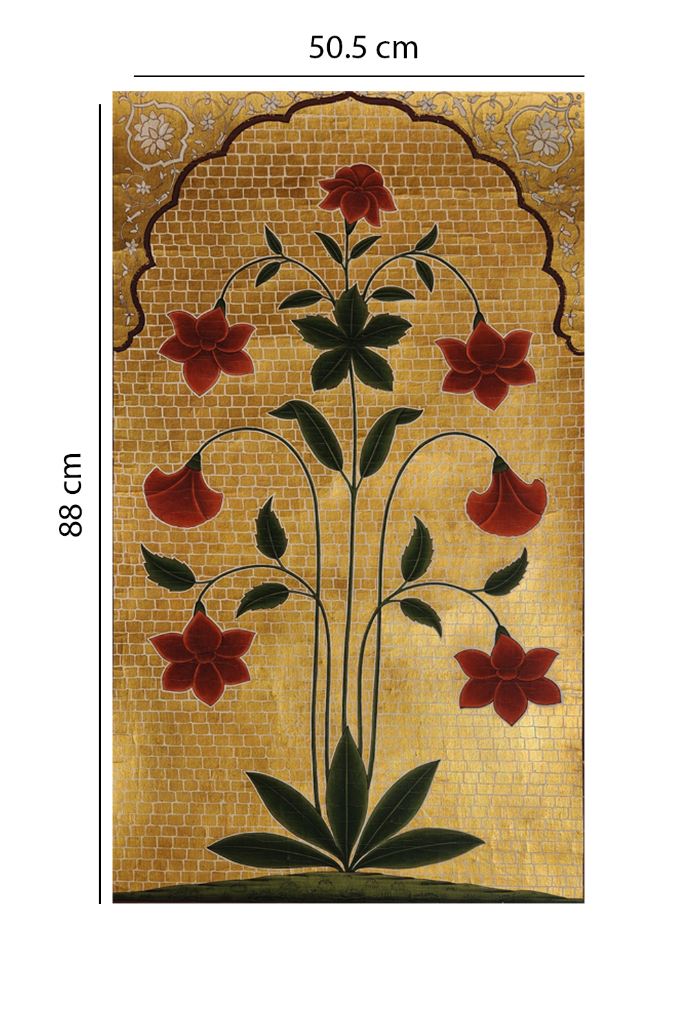 “Guldaan-e-Zar” is a celebration of floral symmetry and regal ornamentation. This hand-painted panel captures a stylized bouquet of red flowers blooming from a lush green base, each petal and leaf meticulously rendered in original mineral colors. The composition is framed by a golden backdrop reminiscent of antique brickwork or mosaic tiles, lending the piece a sense of architectural grandeur. An arch-like motif crowns the top, evoking the elegance of Mughal niches and temple frescoes. The artwork invites viewers into a space where nature meets geometry, and tradition meets timeless beauty. It is ideal for interiors that seek cultural depth, botanical rhythm, and a touch of opulence.
