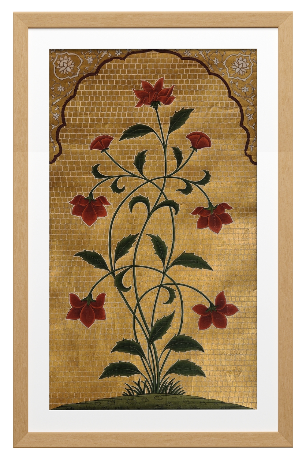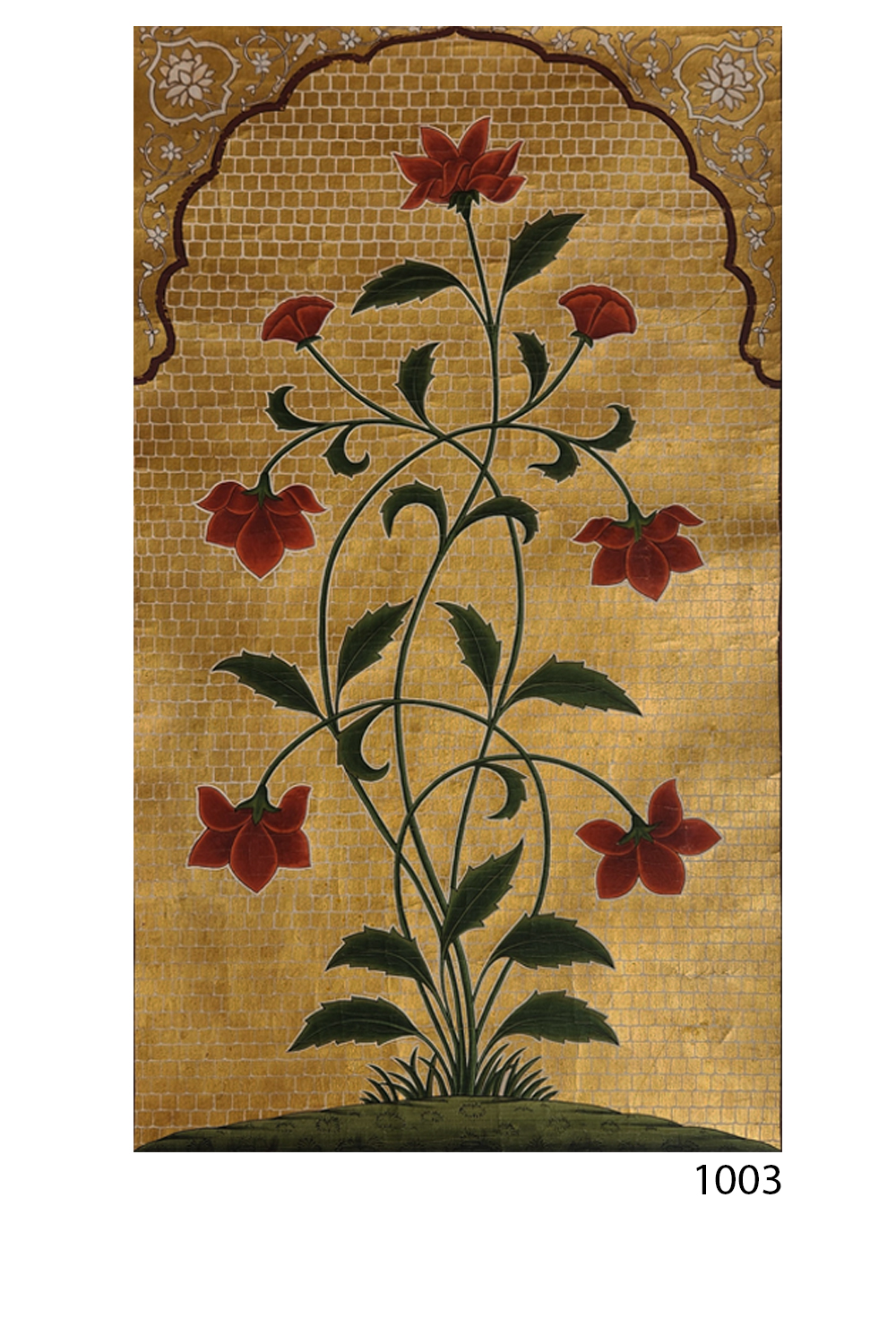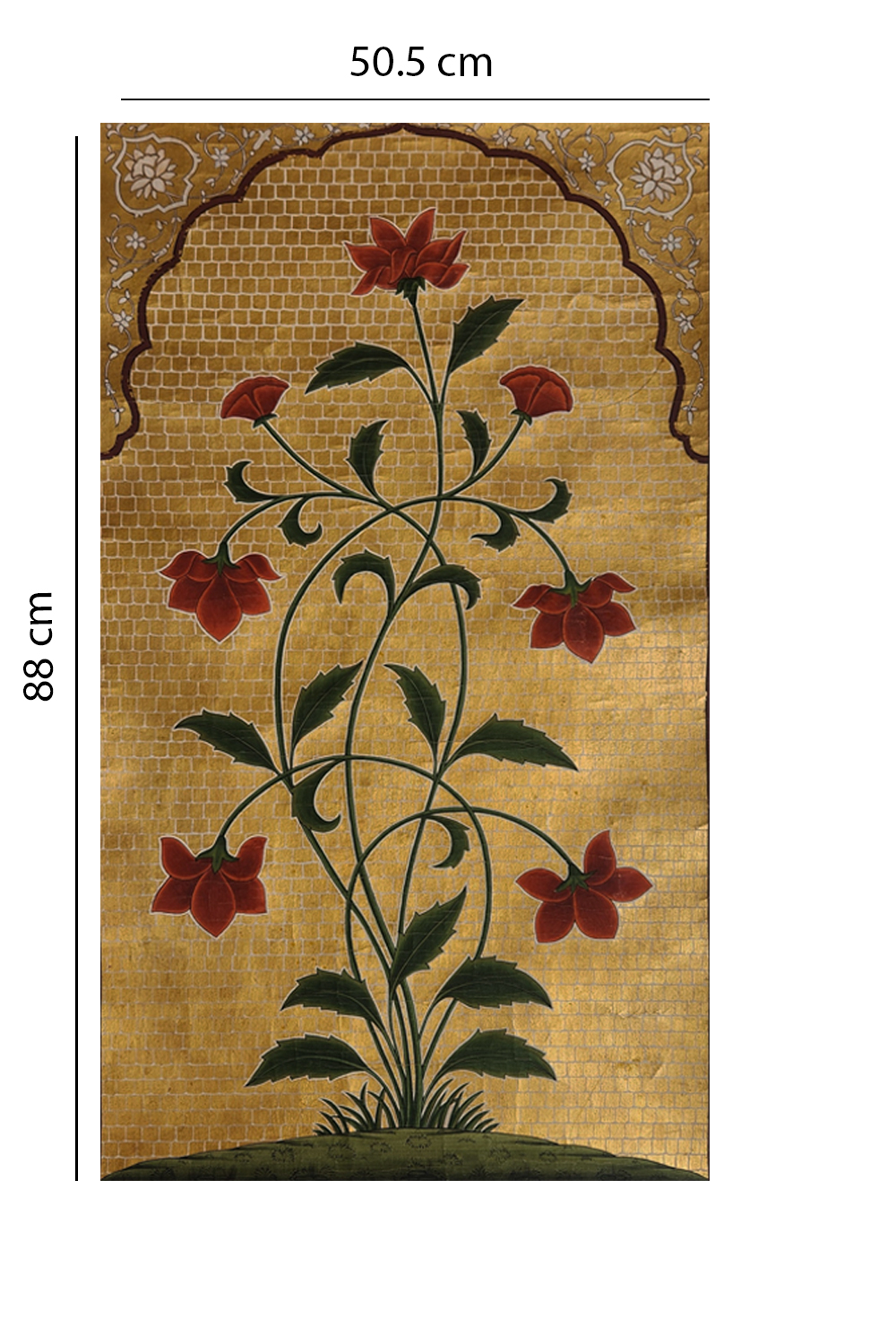 “Phoolon Ki Jhilmil” is a heritage-inspired panel painting that celebrates the timeless elegance of Indian floral artistry. The composition centers around a symmetrical plant form, its curved stems adorned with vibrant red blossoms and verdant leaves. Set against a shimmering golden background reminiscent of antique mosaic work, the artwork evokes both regal charm and botanical serenity. The arch-like top border, embellished with delicate corner motifs, adds a temple-like framing to the piece—making it ideal for both contemporary and traditional interiors. Hand-painted using original mineral colors, this panel carries the tactile richness and authenticity of classical Indian miniature techniques, reimagined for modern display.