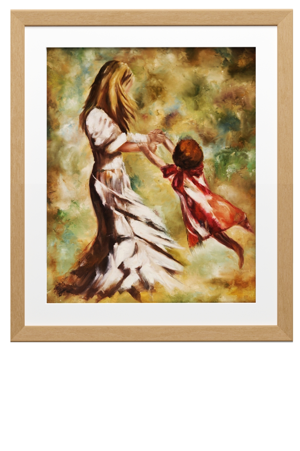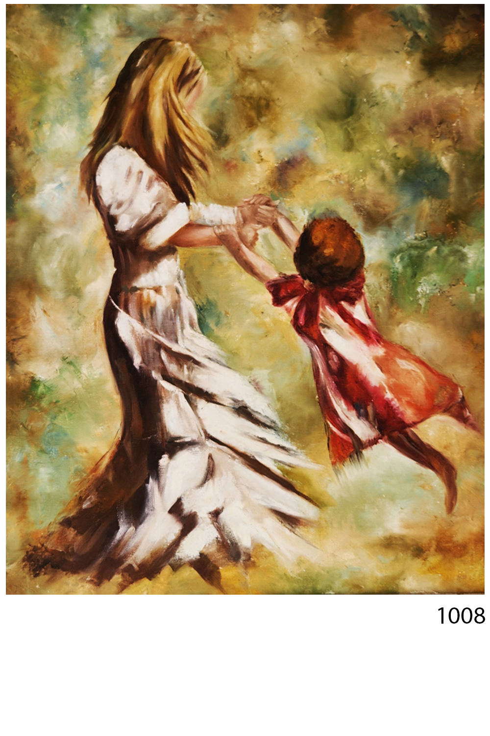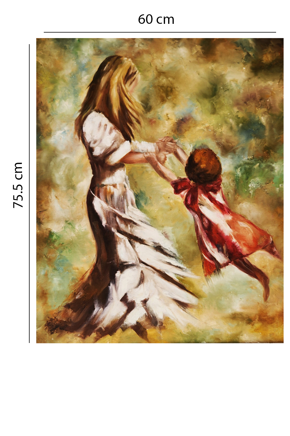 “Jhilmil Pal” is a celebration of maternal joy and childhood wonder, painted with expressive brushwork and emotional clarity. The composition centers on a woman in a flowing white dress, gently swinging a child in a red frock through the air. Their connection is palpable—capturing a fleeting moment of laughter, trust, and movement. The background, a blend of earthy greens, ochres, and warm browns, creates a dynamic yet intimate atmosphere, allowing the figures to glow with life. Crafted using original mineral colors, this oil painting carries the tactile richness and chromatic depth of traditional techniques. It’s a piece that speaks to memory, emotion, and the timeless bond between generations—perfect for interiors that value storytelling and warmth.