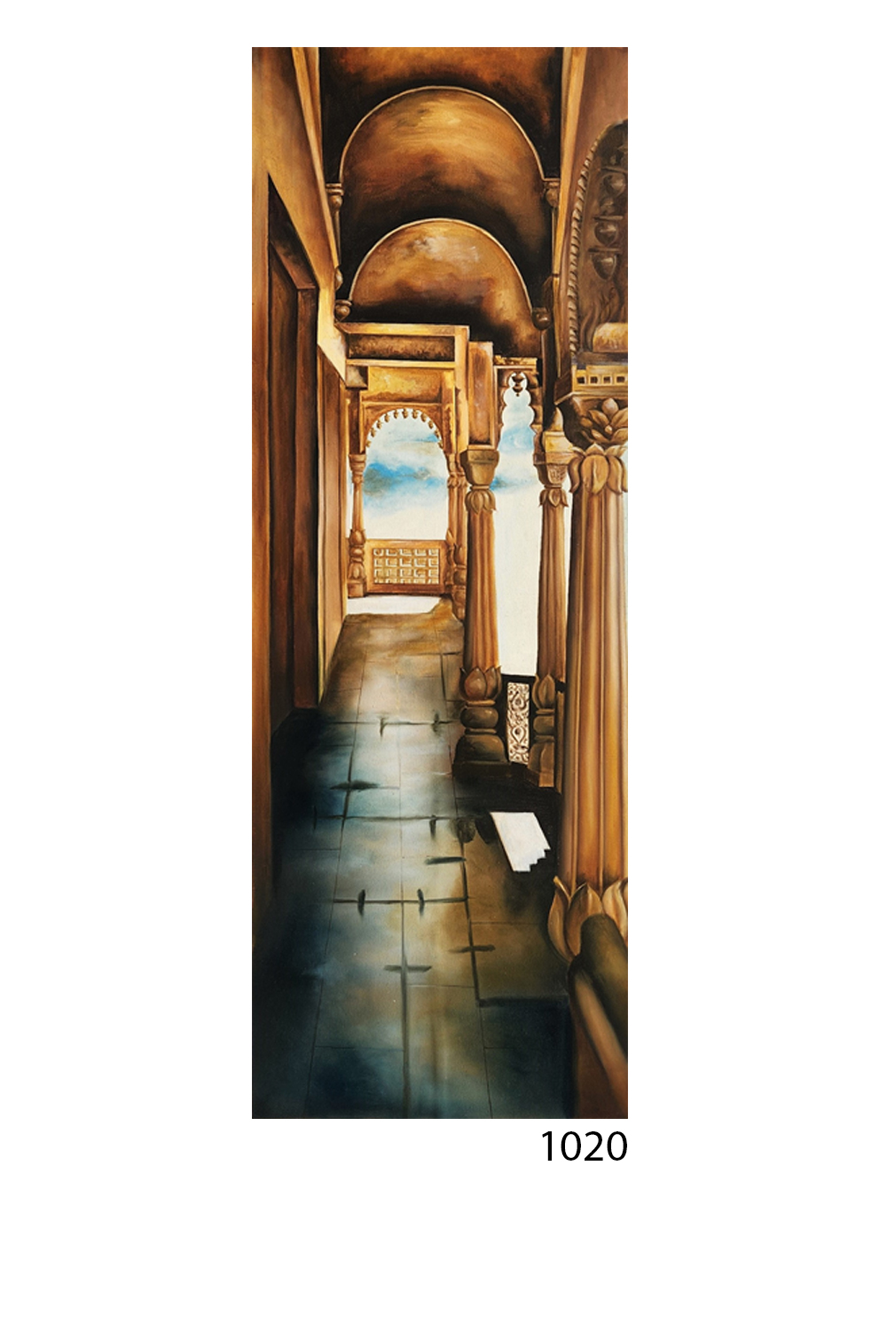 “Sheesh Mahal Ki Jhalak” captures the poetic transition from shadow to light, guiding the viewer through a richly detailed corridor of arches and columns that culminates in a bright, open balcony. The architectural elements—ornate carvings, rhythmic pillars, and vaulted arches—are inspired by classical Indian and Middle Eastern design traditions. The perspective draws the eye forward, creating a sense of depth and movement, while the distant blue sky and landscape offer a moment of visual release and serenity. Painted using original mineral pigments, this oil panel carries the tactile richness and chromatic permanence of heritage techniques. The warm palette of browns, golds, and sunlit blues evokes both grandeur and calm, making this piece ideal for interiors that celebrate cultural storytelling and spatial elegance.